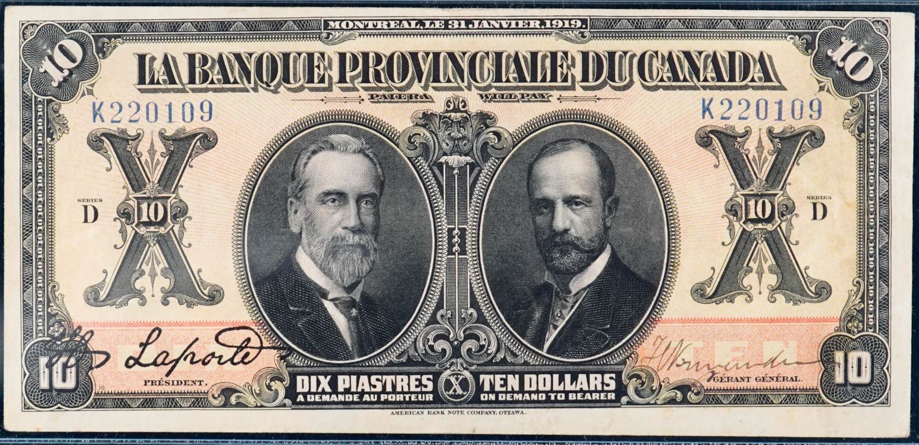 La Banque Provinciale du Canada 1919 $10 "Orange Tint" CH-615-14-12 #K220109 LCG Choice Extra Fine-45. Believed to be the finest known. A bright and very desirable example.