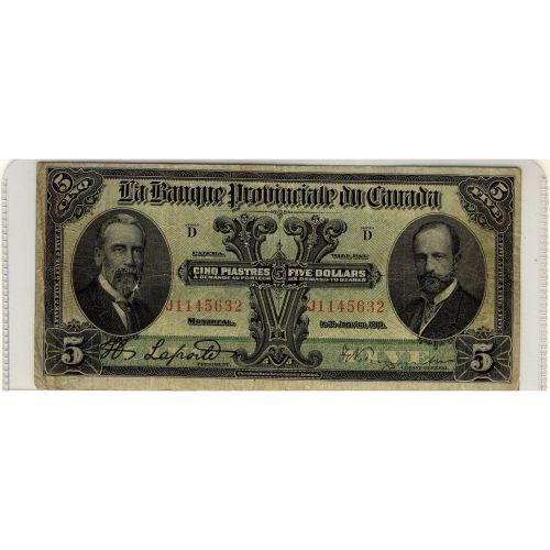 La Banque Provinciale du Canada 1919 $5 , CH-615-14-06 #J1145632, F/VF, Note remains strong in colour and tint, a nice example.