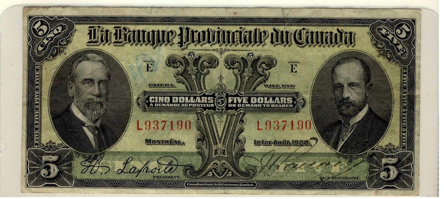 La Banque Provinciale du Canada, 1928 $5 CH-615-14-08 #L937190. F-VF in grade with two minor tears in upper border and #42 in crayon.