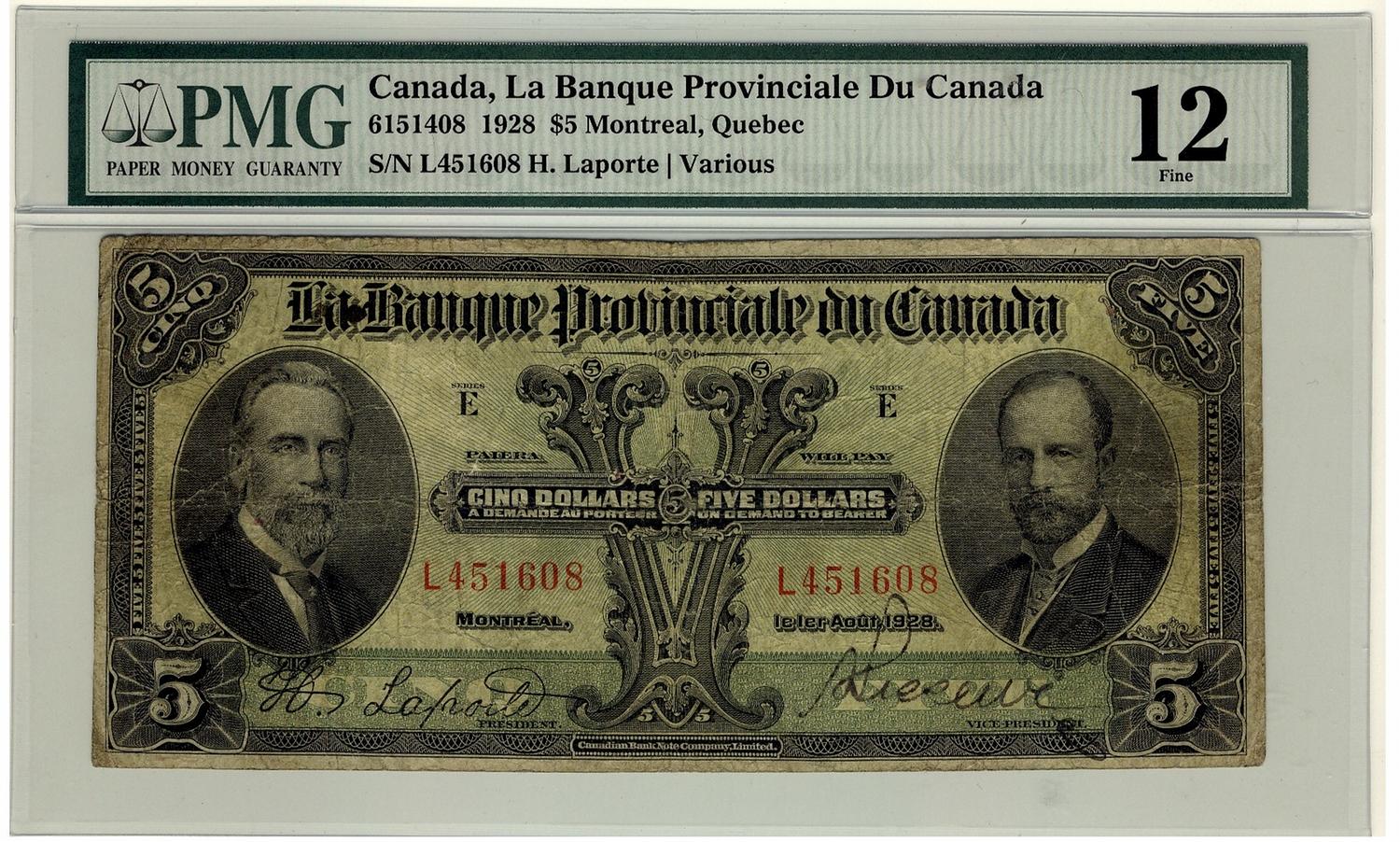 La Banque Provinciale du Canada, 1928 $5 #L451608, PMG F12,