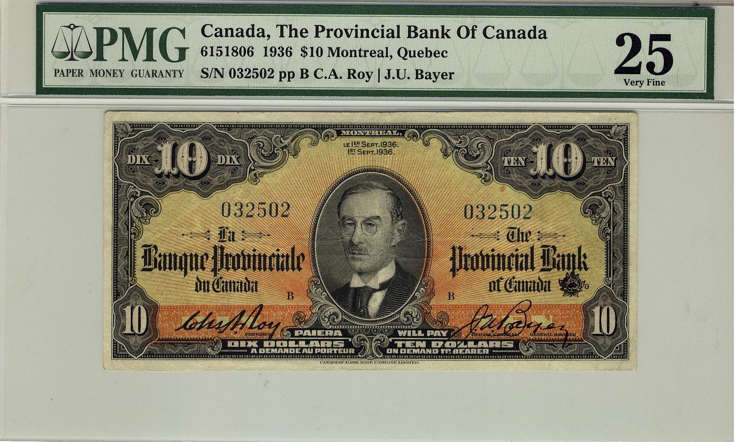 La Banque Provinciale du Canada, 1936 $10 #032502, CH-615-18-06, PMG VF25.