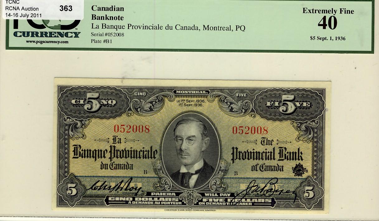 La Banque Provinciale du Canada 1936 $5 052008 CH-615-18-02 PCGS EF40