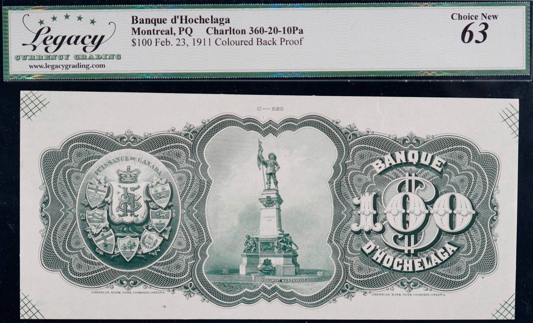 La Banque d'Hochelaga 1911 $100 CH-360-20-10Pa - Coloured Back Proof LCG Choice Uncirculated-63, small edge tear.