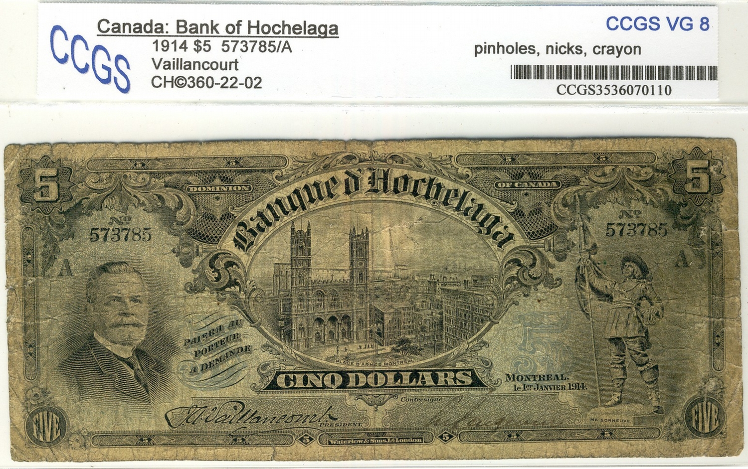 La Banque d'Hochelaga 1914 $5 #573785 CH-360-22-02 CCGS VG8. Designated with pinholes, nicks and crayon.