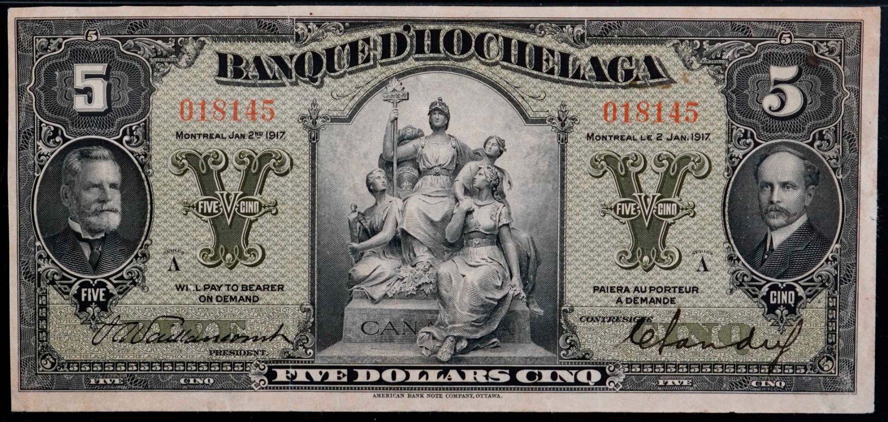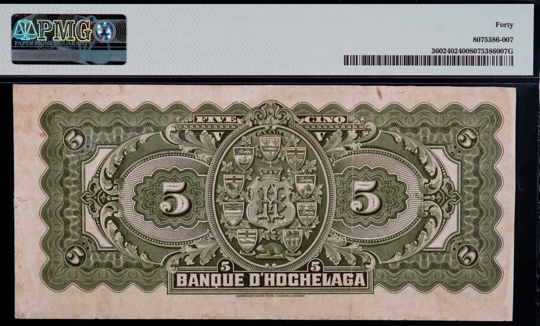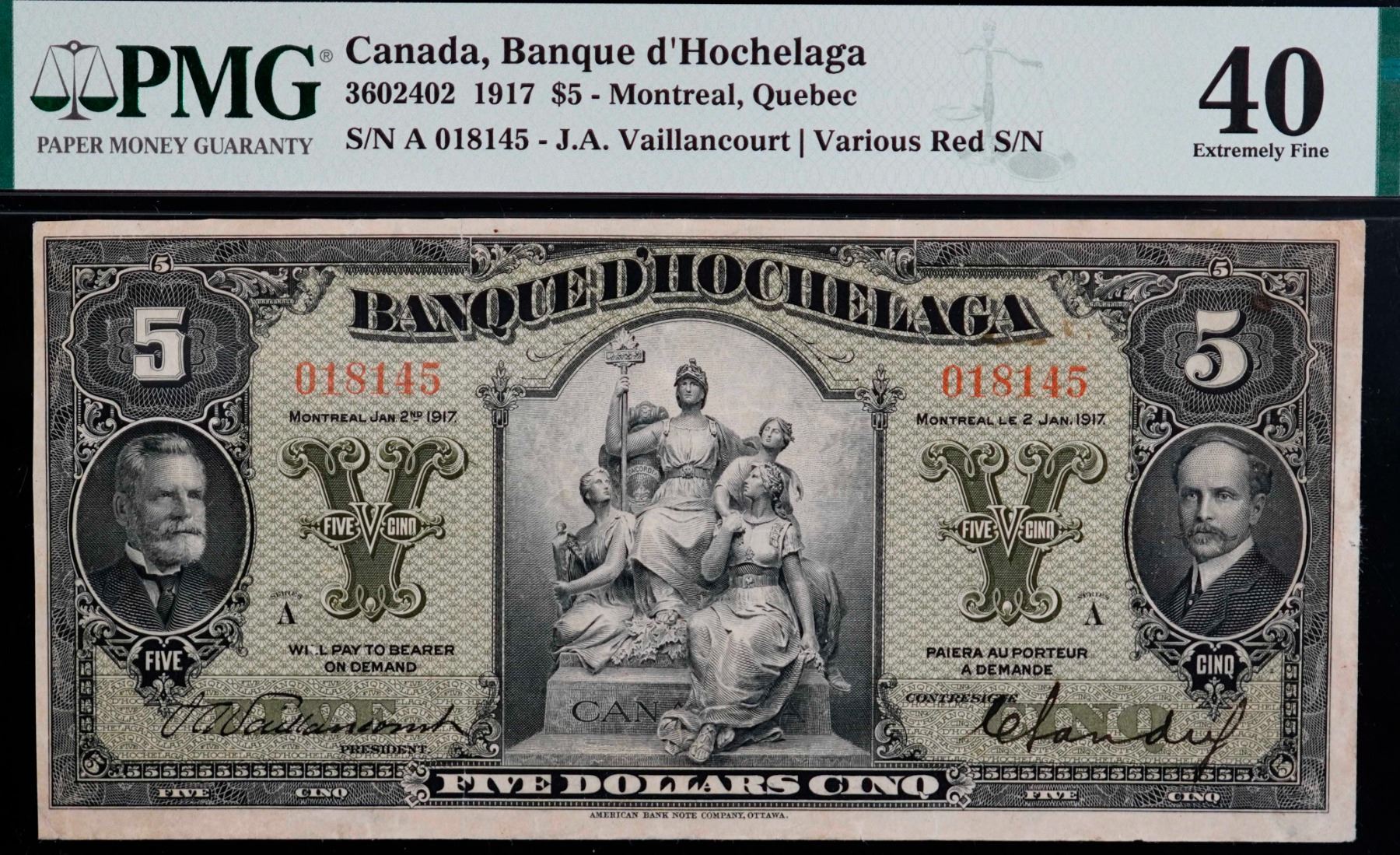 La Banque d'Hochelaga 1917 $5 #018145 CH-360-24-02, PMG Extra Fine-40. A bright example with nice colours.