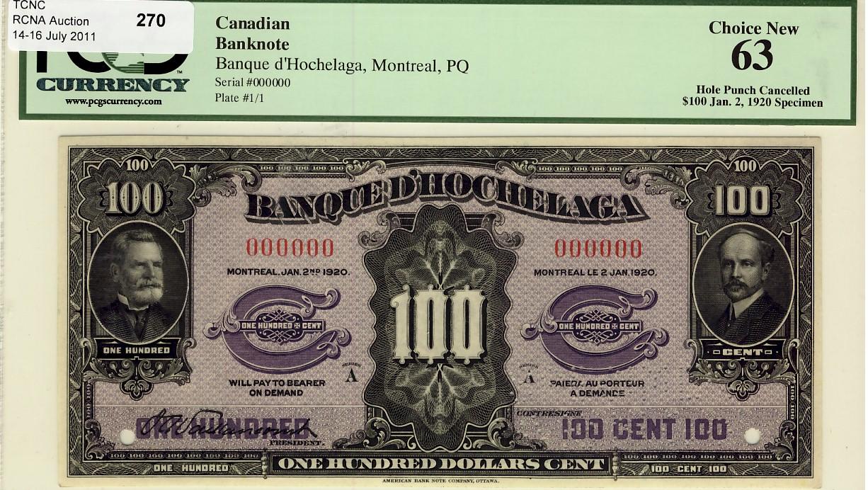 La Banque d'Hochelaga 1920 $100 CH-360-24-30S PCGS UNC63