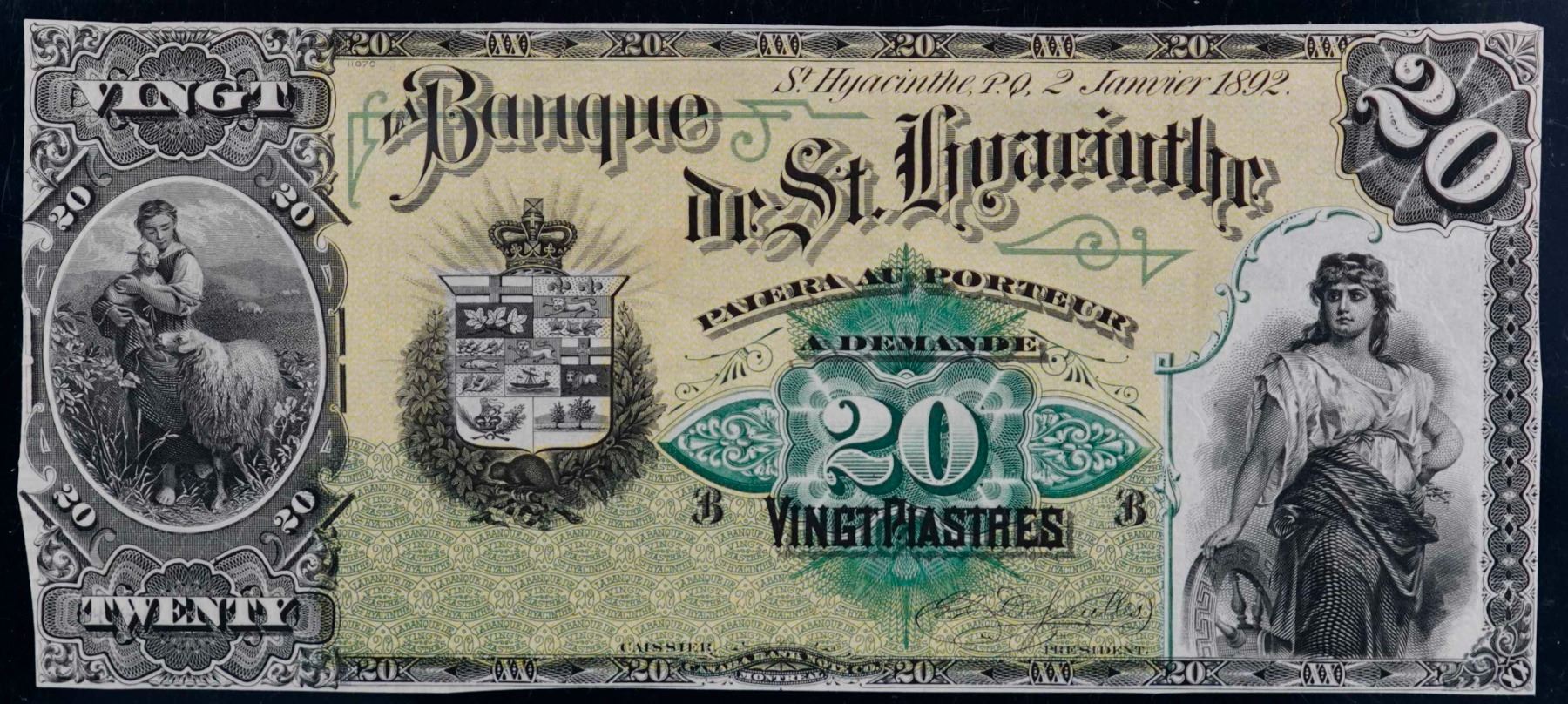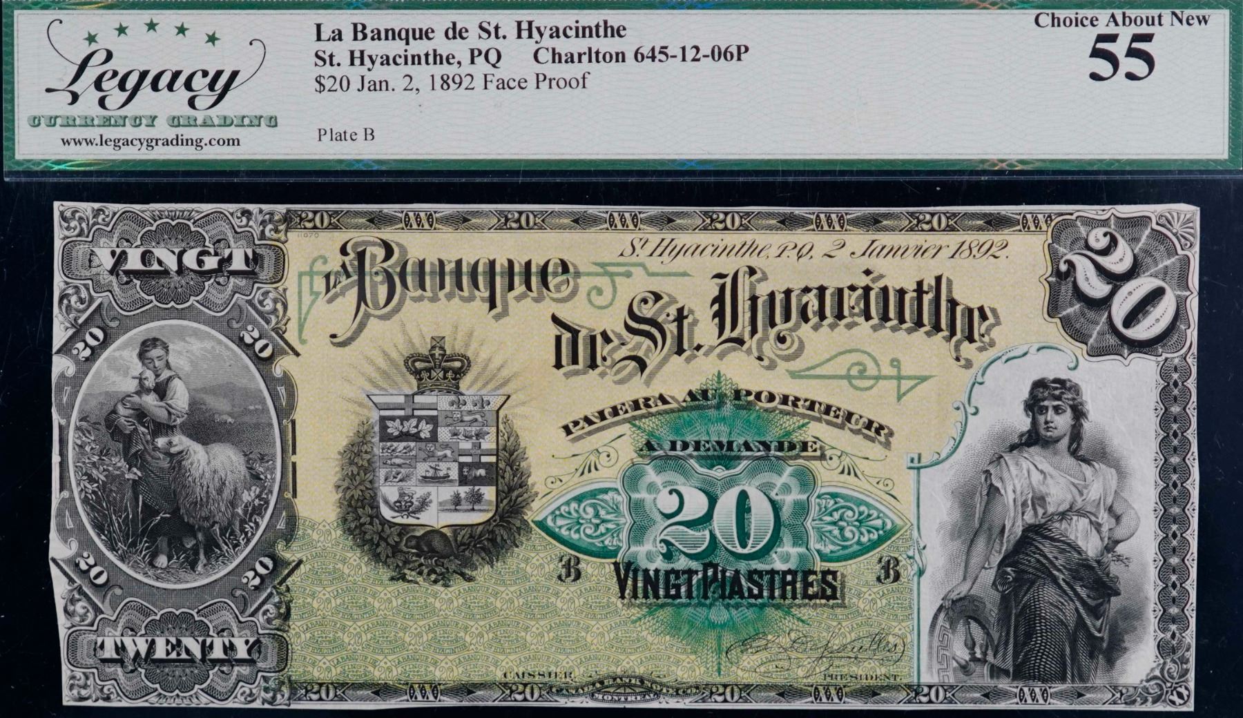 La Banque de St. Hyacinthe; 1892 $20 CH-645-12-06FP, Legacy Currency Grading Choice About Uncirculated-55. Rarely offered.