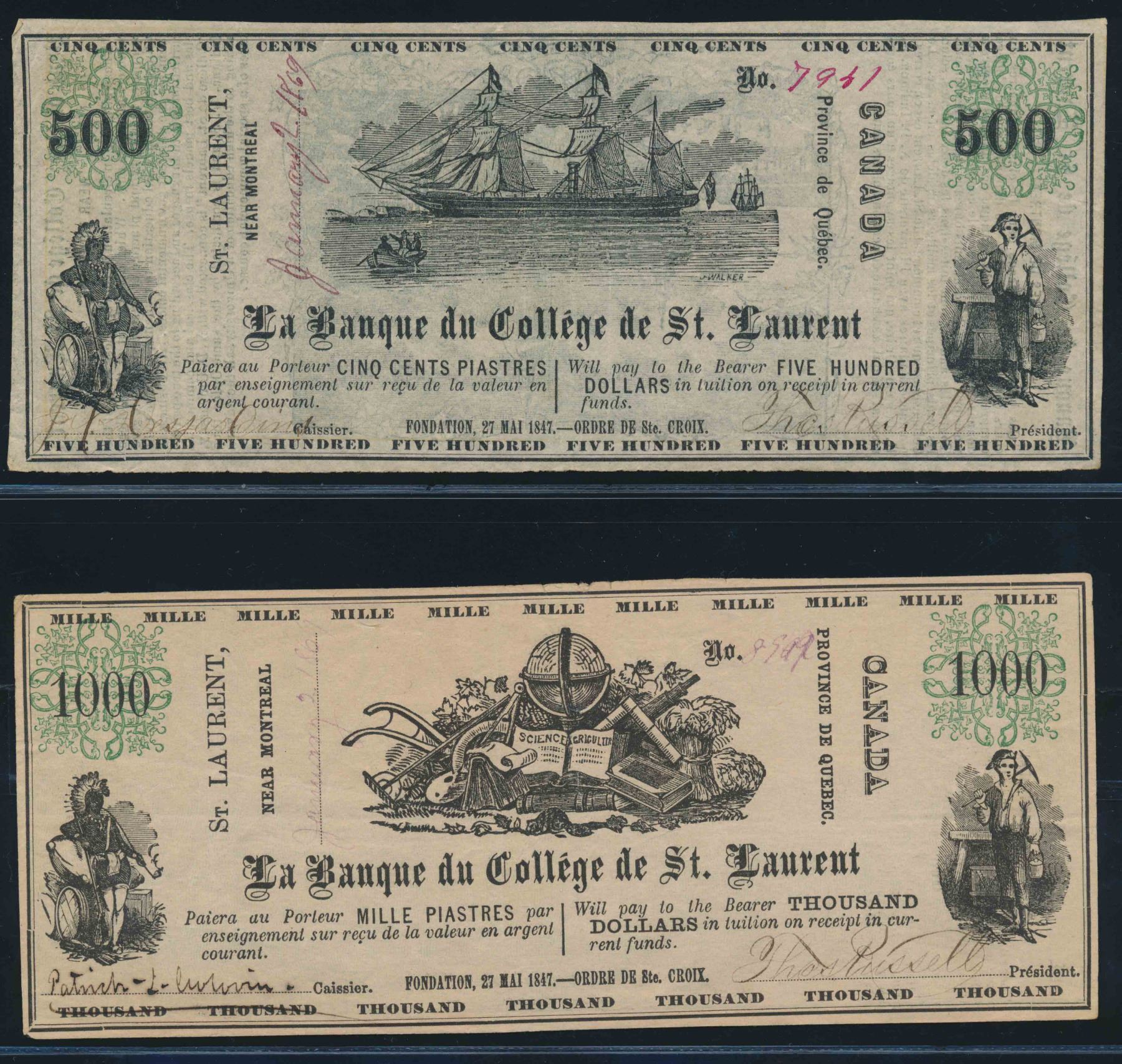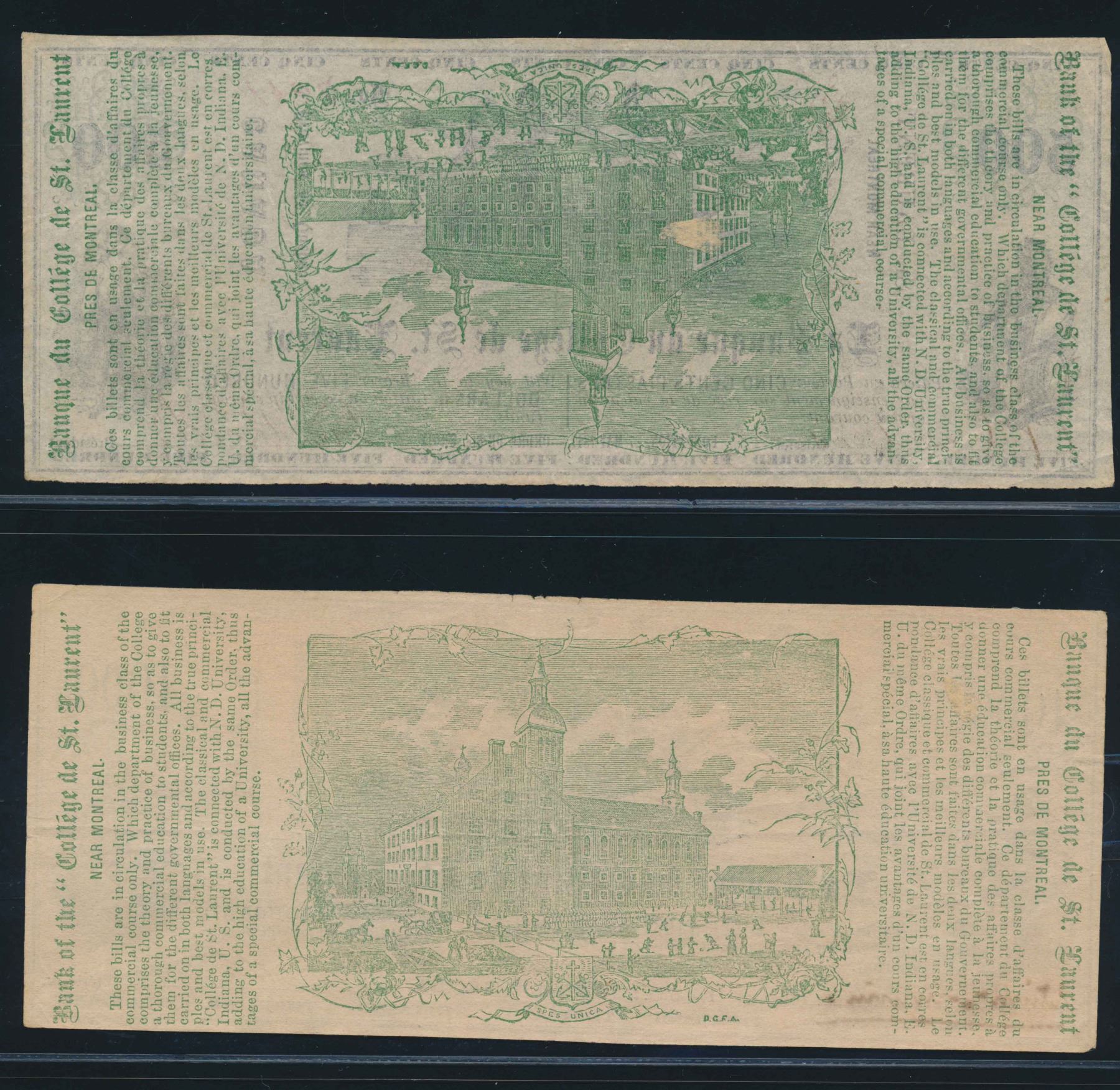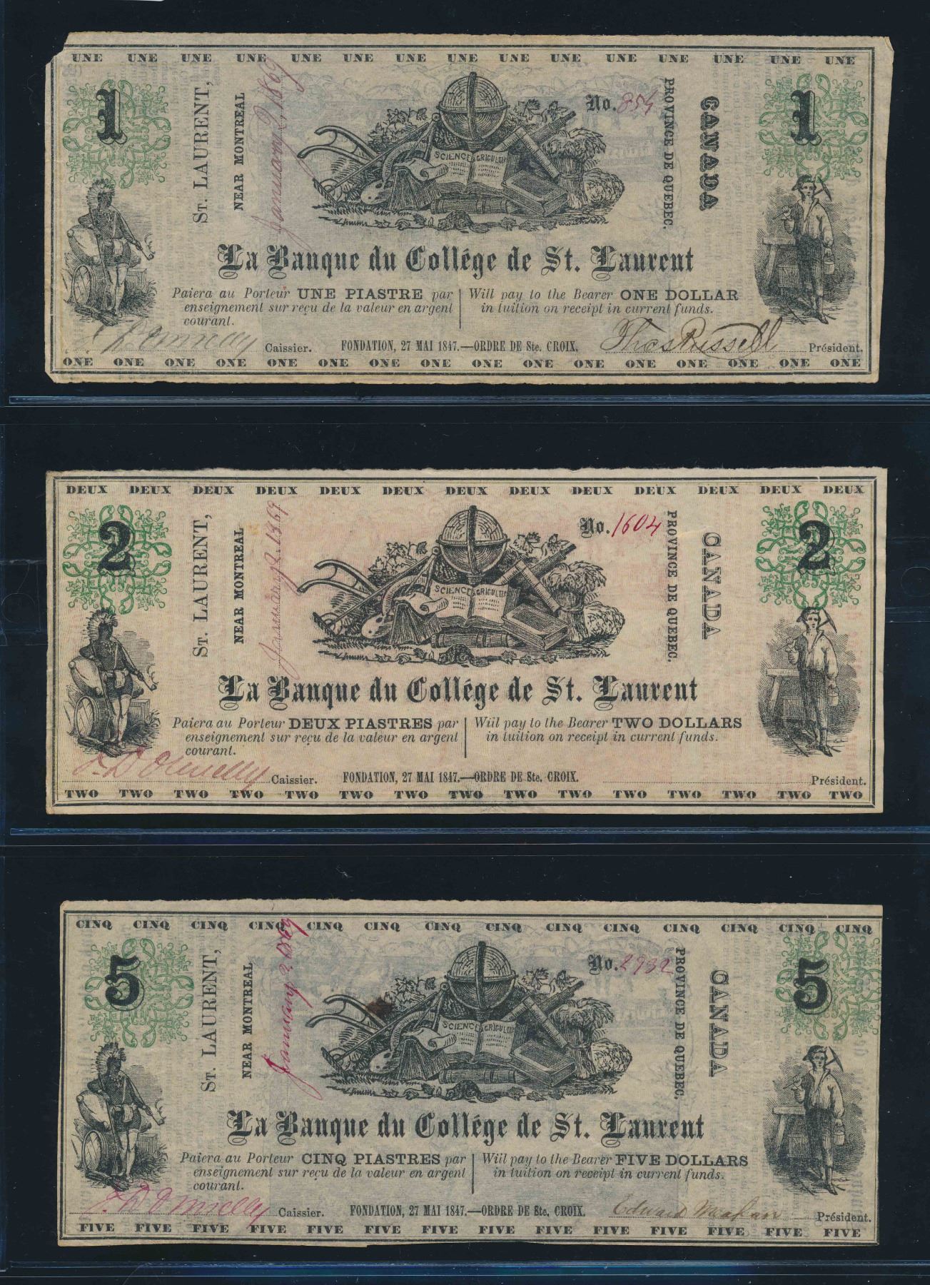 La Banque du College de St. Laurent Set of Eight Numbered, Signed Notes, Hand Dated Jan. 2, 1869 Denominated in Piastres / DollarsPrinted on both sides. Common reverse printed in either red, green or greenish black has an engraving of the college at center, with descriptions of the uses of these notes to left and right, in English and French The obverses have four different central vignettes, with smaller ones of a native man to left, and a blacksmith to right. Bilingual. General condition is VF - EF. , with the exception of a small torn upper left corner on the $1.