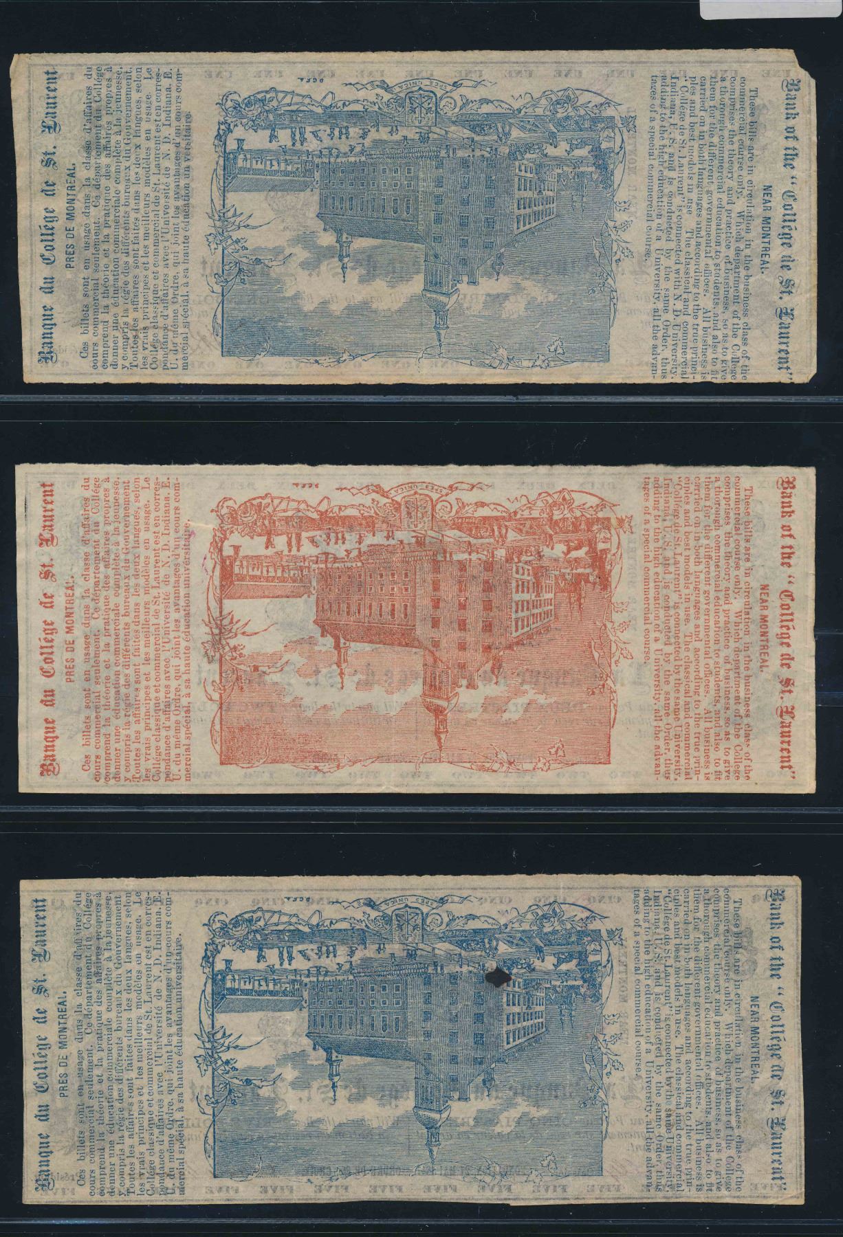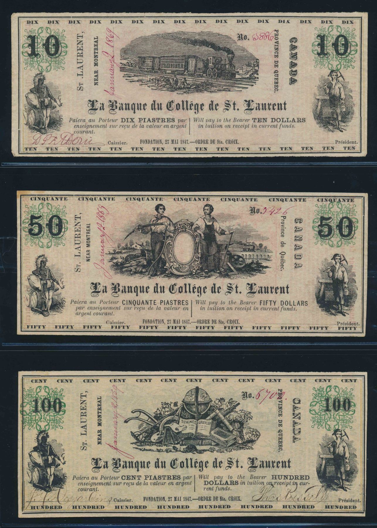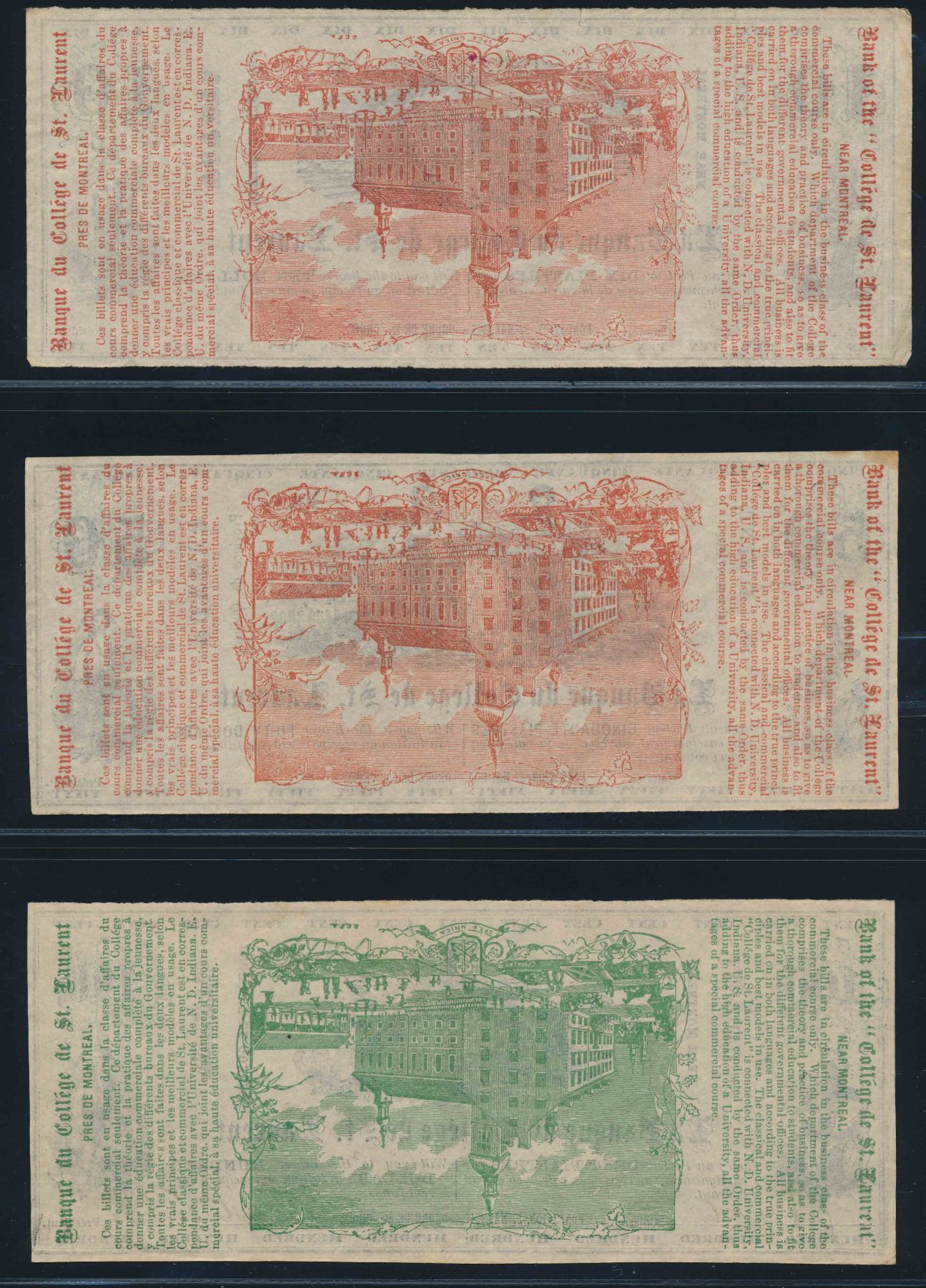 La Banque du College de St. Laurent Set of Eight Numbered, Signed Notes, Hand Dated Jan. 2, 1869 Denominated in Piastres / DollarsPrinted on both sides. Common reverse printed in either red, green or greenish black has an engraving of the college at center, with descriptions of the uses of these notes to left and right, in English and French The obverses have four different central vignettes, with smaller ones of a native man to left, and a blacksmith to right. Bilingual. General condition is VF - EF. , with the exception of a small torn upper left corner on the $1.