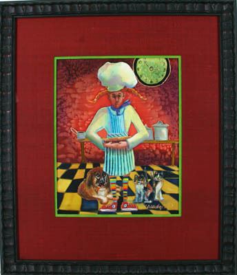 Description: It’s fun to have company in the kitchen, no matter the species. This is a plug for women chefs!