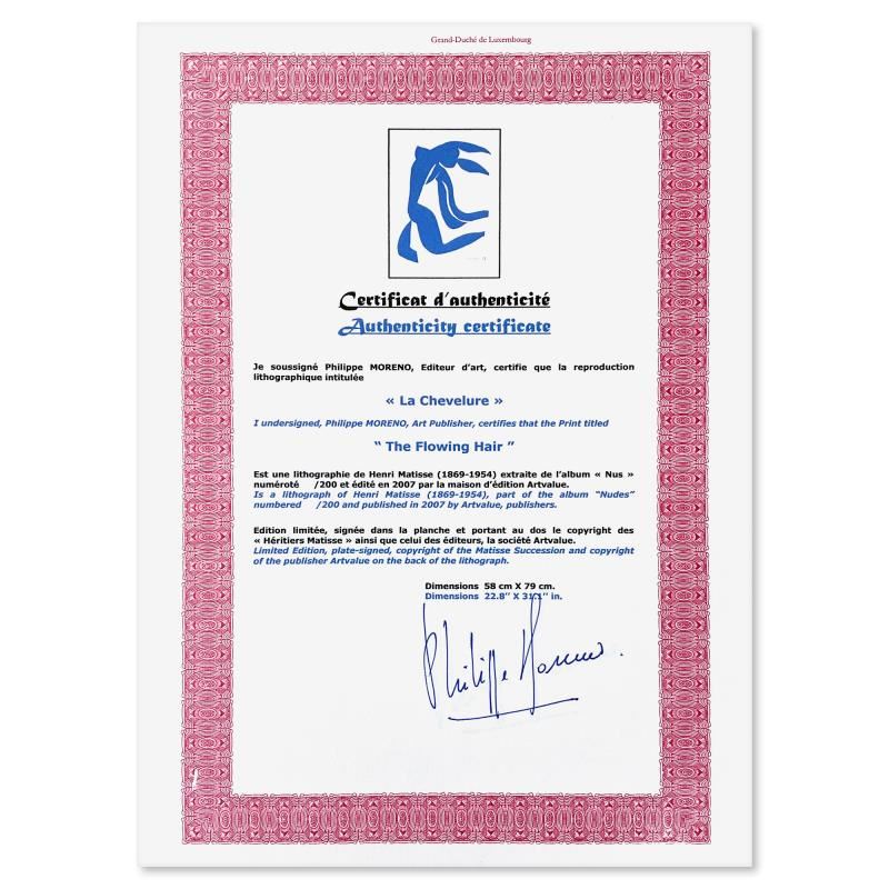 "La Chevelure" is a limited edition lithograph by Henri Matisse (1869-1954) bearing the plate signature of the artist. This piece comes from an edition of 200 authorized by the Matisse Estate; the edition number is not on the piece itself but on the certificate. This piece comes custom framed. Includes Certificate of Authenticity. Measures approx. 28.5" x 37" (frame), 22.5" x 31" (image).