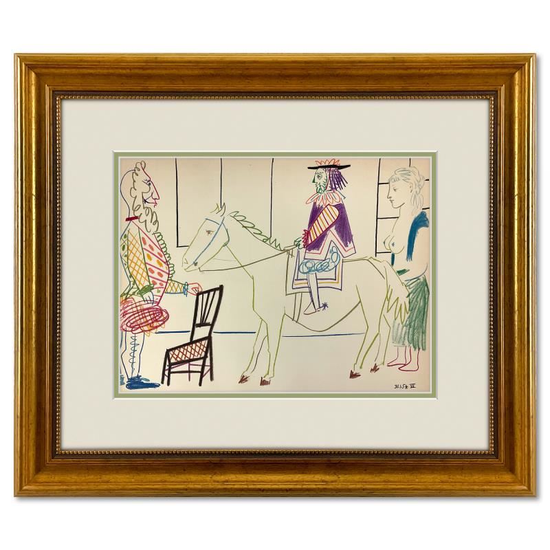 "La Comedie Humaine 31.1.54-VII" is a lithograph on paper by Pablo Picasso (1881-1973). This piece is from Picasso's Human Comedy Series and was printed in Paris, France by Mourlot Studios in 1954. This piece comes framed. Includes Letter of Authenticity. Measures approx. 18" x 21" (frame), 10" x 13" (image). This item requires special handling and may have a longer than usual turnaround.