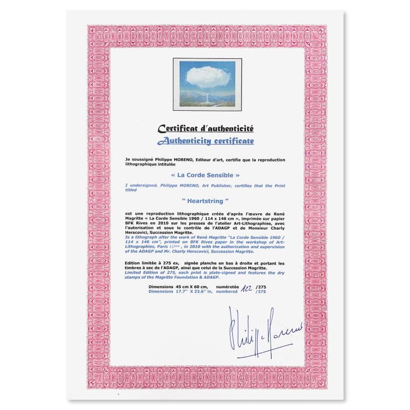 "La Corde Sensible (Heartstring)" is a limited edition lithograph by Rene Magritte (1898-1967). This piece is numbered 122/275 and bears the dry stamps of the Magritte Foundation & ADAGP (Society of Authors in the Graphic and Plastic Arts) and is signed by the President of the Magritte Foundation, Charly Herscovici. This piece comes custom framed. Includes Certificate of Authenticity. Measures approx. 29.5" x 24" (frame), 23.5" x 18" (image). This item requires special handling and may have a longer than usual turnaround.