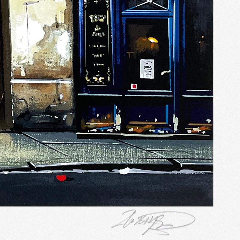 "La Cour de Commerce" is a limited edition printers proof serigraph on paper by Thomas Pradzynski (1951-2007), numbered 1/3 and hand signed by the artist. Includes Letter of Authenticity. Measures approx. 17" x 24" (border), 10.5" x 18" (image).