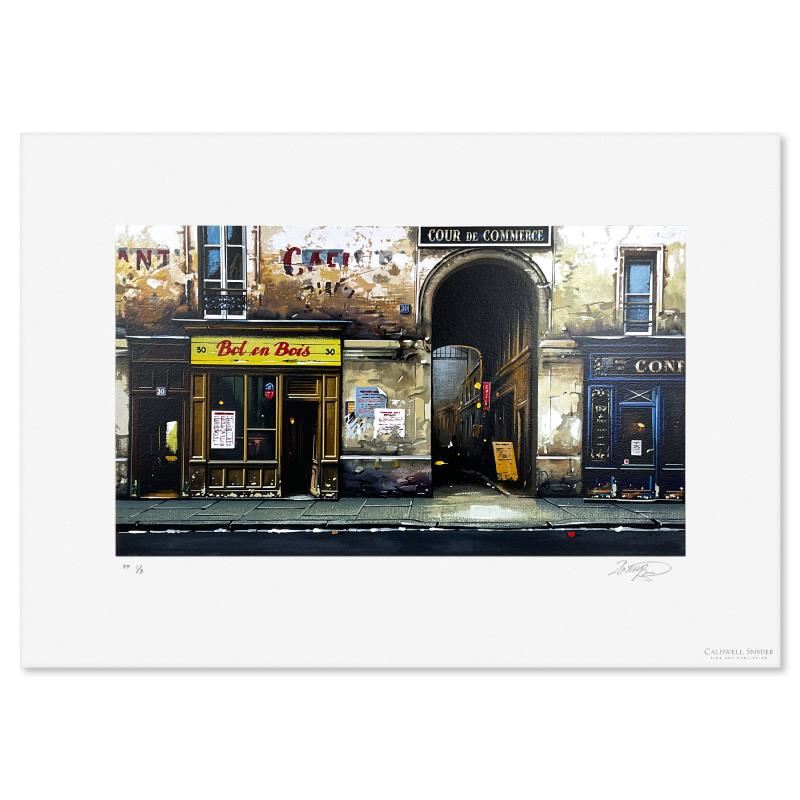 "La Cour de Commerce" is a limited edition printers proof serigraph on paper by Thomas Pradzynski (1951-2007), numbered 1/3 and hand signed by the artist. Includes Letter of Authenticity. Measures approx. 17" x 24" (border), 10.5" x 18" (image).