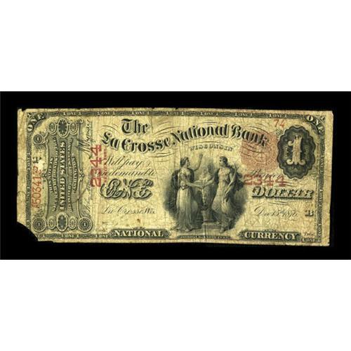 <B>La Crosse, WI</B></I> - $1 1875 Fr. 384 <B>The La Crosse NB</B></I> Ch. # 2344<BR> A banker had the sense to set aside a large number of aces from this bank including many of the notes serial numbers 1 through 100. This piece is serial number 74 and like so many from that group, it saw extensive use in the Wisconsin channels of commerce. A couple of splits, including a large repaired tear and a missing corner must be mentioned for the sake of accuracy. <B>Very Good.</B></I><BR><BR><b>Shipping:</b> Coins & Currency (<a target="_blank" href="http://www.heritageauctions.com/common/shipping.php">view shipping information</a>)