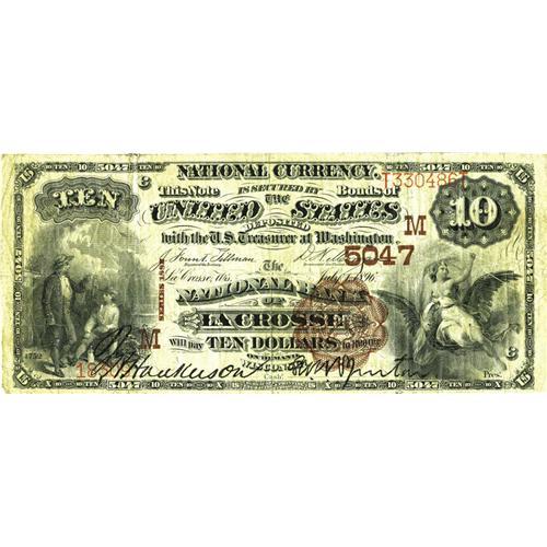 <B>La Crosse, WI</B></I> - $10 1882 Brown Back Fr. 487 <B>The NB of La Crosse</B></I> Ch. # 5047<BR>Moderate amounts of circulation failed to compromise the paper or the color. <B>Fine+.</B></I><BR><I>From The Troy Wiseman Collection</B></I>