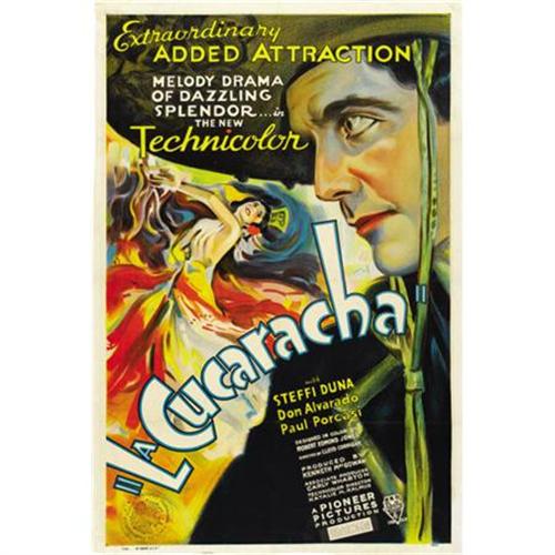 <B>La Cucaracha (RKO, 1934).</B></I> One Sheet (27" X 41"). This is one of the cornerstone historical posters of the motion picture industry. It is rare enough just in itself; it's a one sheet for a 21-minute short subject film. But the interest lies in the fact that this was the first film to be shot 'entirely' in the three strip Technicolor process. This film won an Oscar for Best Short Subject - Comedy. There is restoration for pinholes, a Danish censor stamp in the lower left corner, and 1/4" to 1/2" missing paper in the bottom border, two-thirds of the way across the poster. This lovely poster still shines with great color and whirling design. Fine on Paper. ****<BR><BR><b>Shipping:</b> Flat Material, Small (<a target="_blank" href="http://www.heritageauctions.com/common/shipping.php">view shipping information</a>)