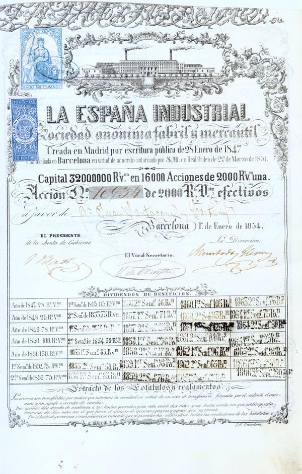 1854, Spain. Vignette of factory building at top. Black. Attached adhesive revenues. Stamp cancelled on verso and fine.