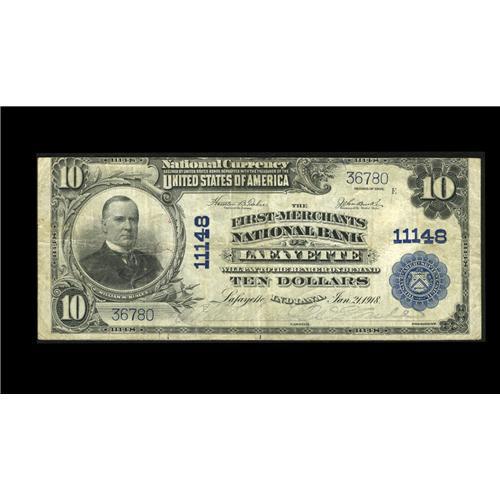 <B>La Fayette, IN</B></I> - $10 1902 Plain Back Fr. 632 <B>The First-Merchants NB</B></I> Ch. # 11148<BR>Even wear and legible signatures of O.M. Schnaible and W.G. Gude are merits of this $10. <B>Fine.</B></I>