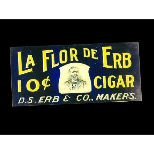 La Flor De Erb Cigar Embossed tin over cardboard sign. String hanger. National Sign Co., Dayton OH. Excellent original condition. 13 1/2 x 6 1/4 inches.