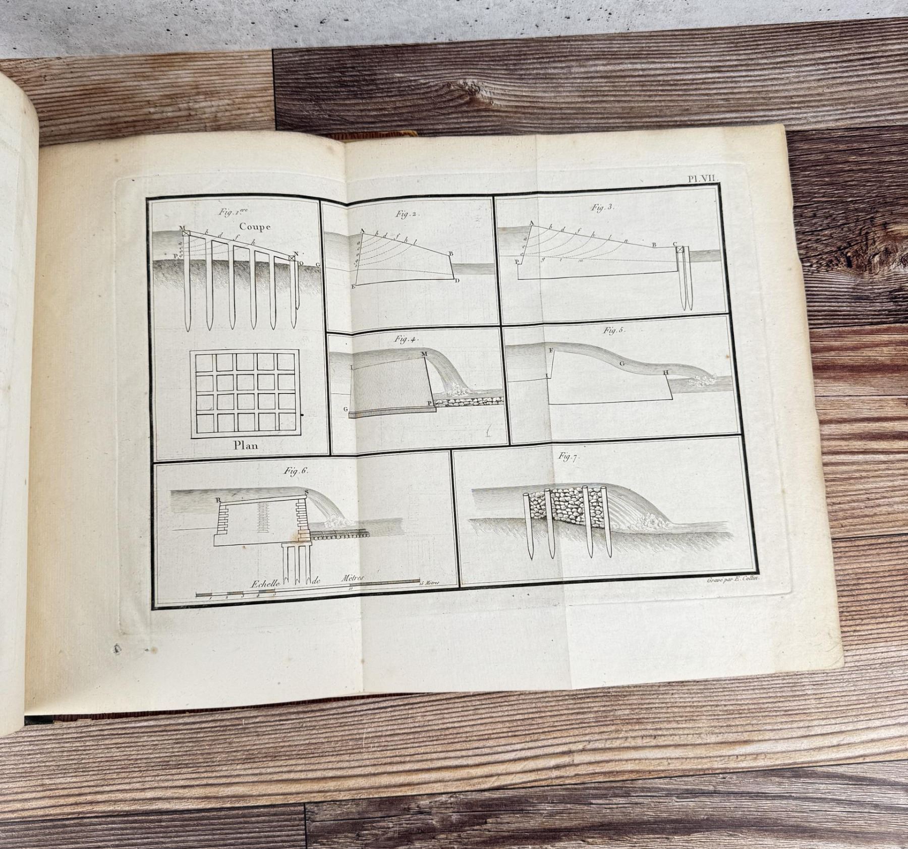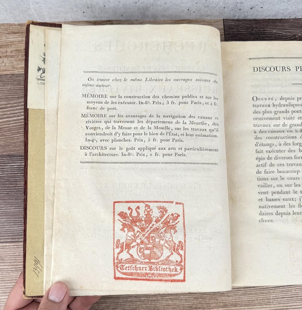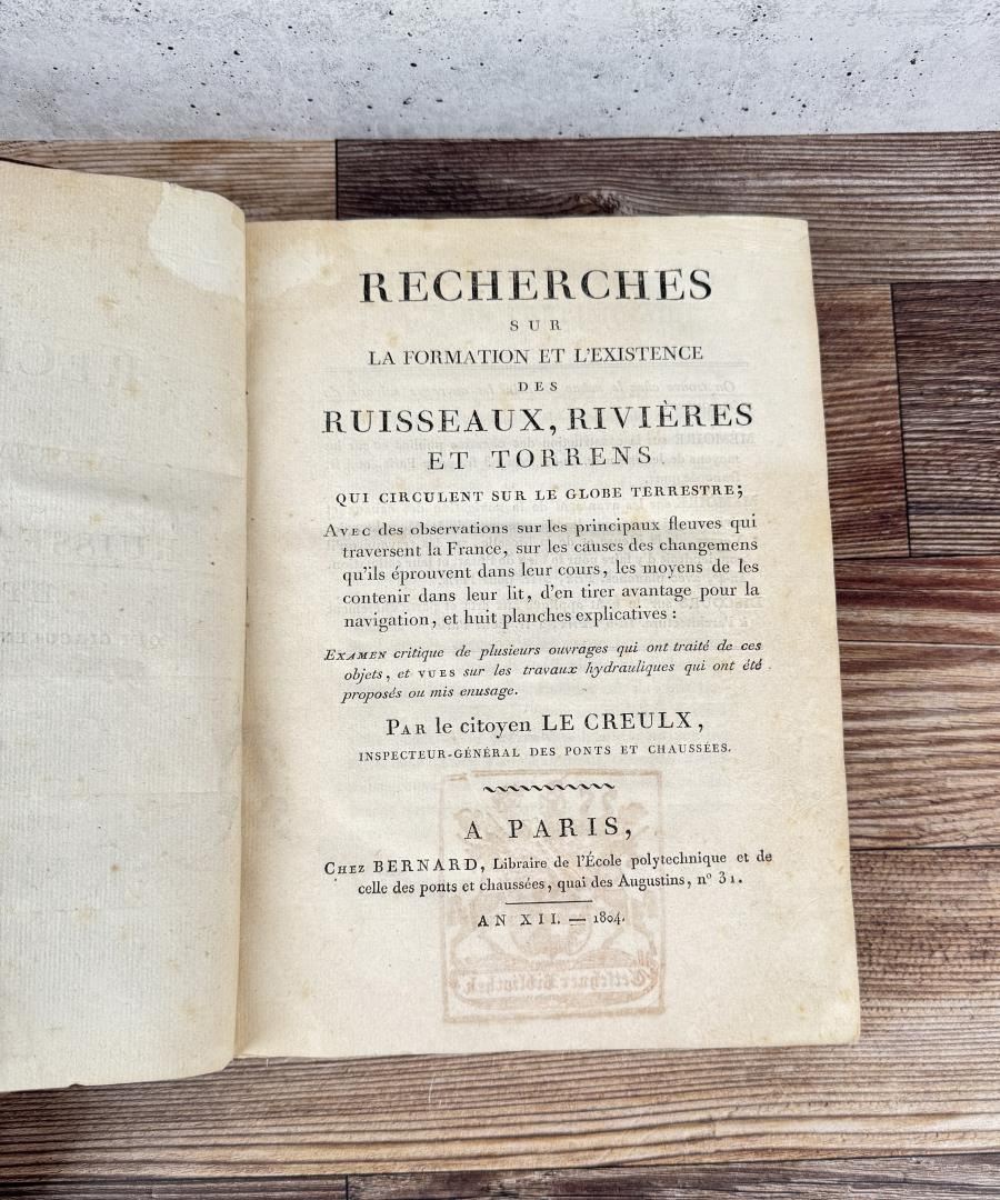 Rivieres Et Torrens. Research On The Formation And Existence Of Streams, Rivers and Torrents. Francois-Michel Le Creulx, 1804. This volume bears the stamp of the Tetschner Library which was seized in 1933 by the Czechoslovak Army during the Occupation of Prague. The books were sold in 1934 to Hans Peter Kraus. Kraus was the most successful rare book dealer in the second half of the 20th century. Lecreulx (1734–1812) was one of the most important civil engineers in France during the late 18th and early 19th centuries. He oversaw the construction of a large number of important bridges and in 1801 was appointed inspector general of bridges and roads. He took part in the planning of most of the chief public works programs during the years of the Empire. This work is a comprehensive theoretical and practical treatise on river control. The excellent plates depict various techniques of damming, embankment, construction of locks, etc.