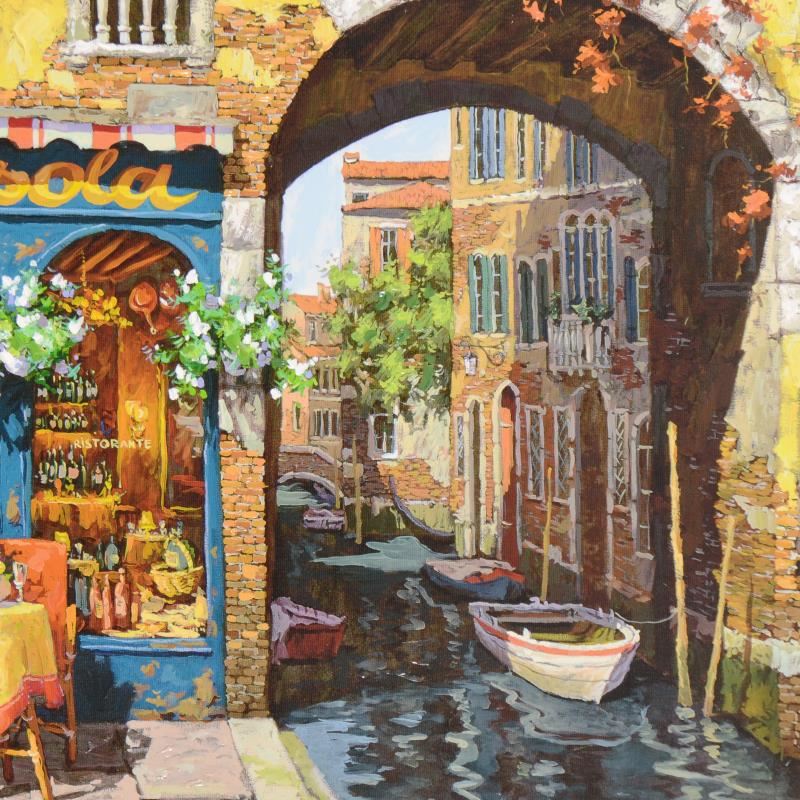 "La Gensola" is a limited edition hand embellished serigraph on canvas by Viktor Shvaiko, numbered and hand signed by the artist. Includes Certificate of Authenticity. Measures approx. 24" x 16" (image).