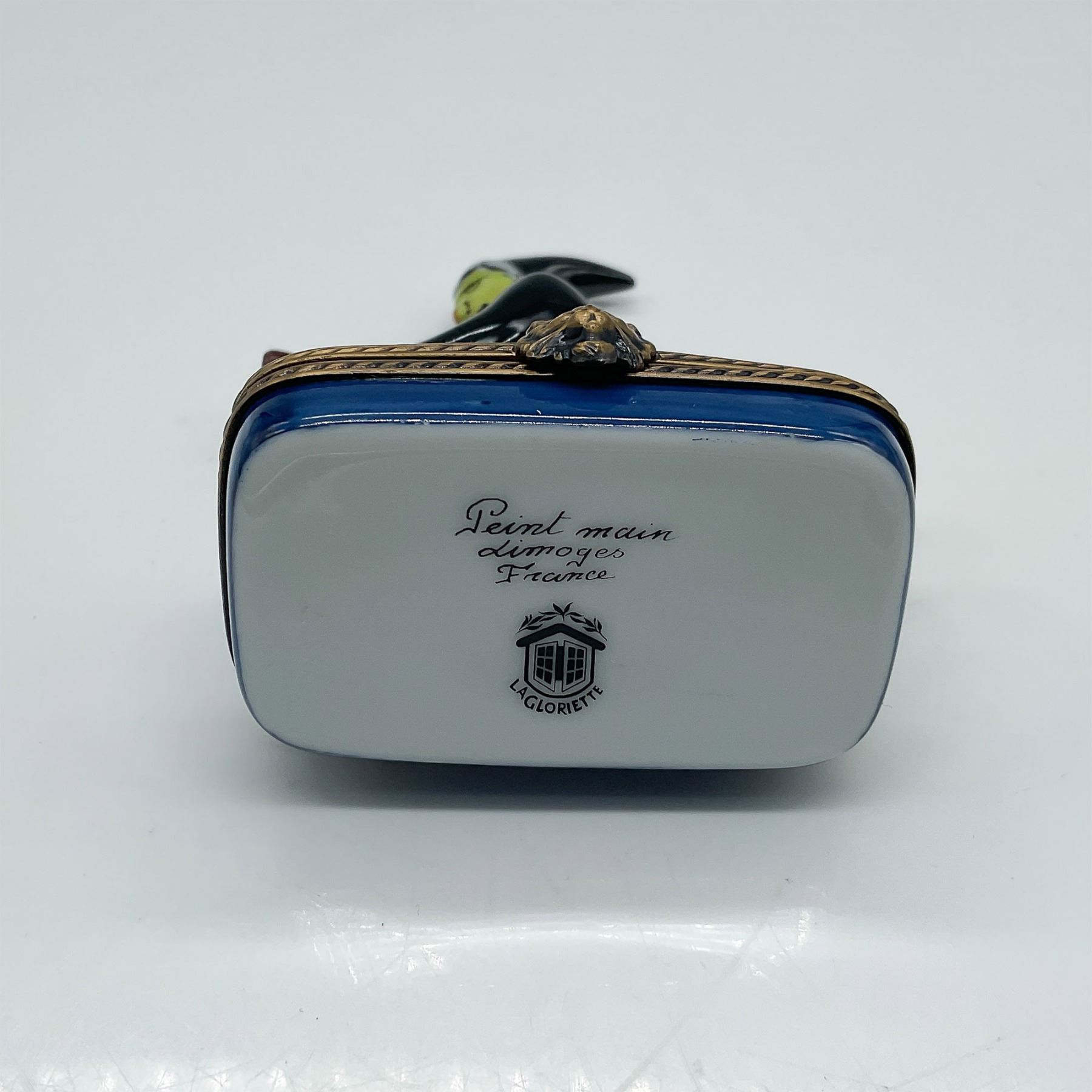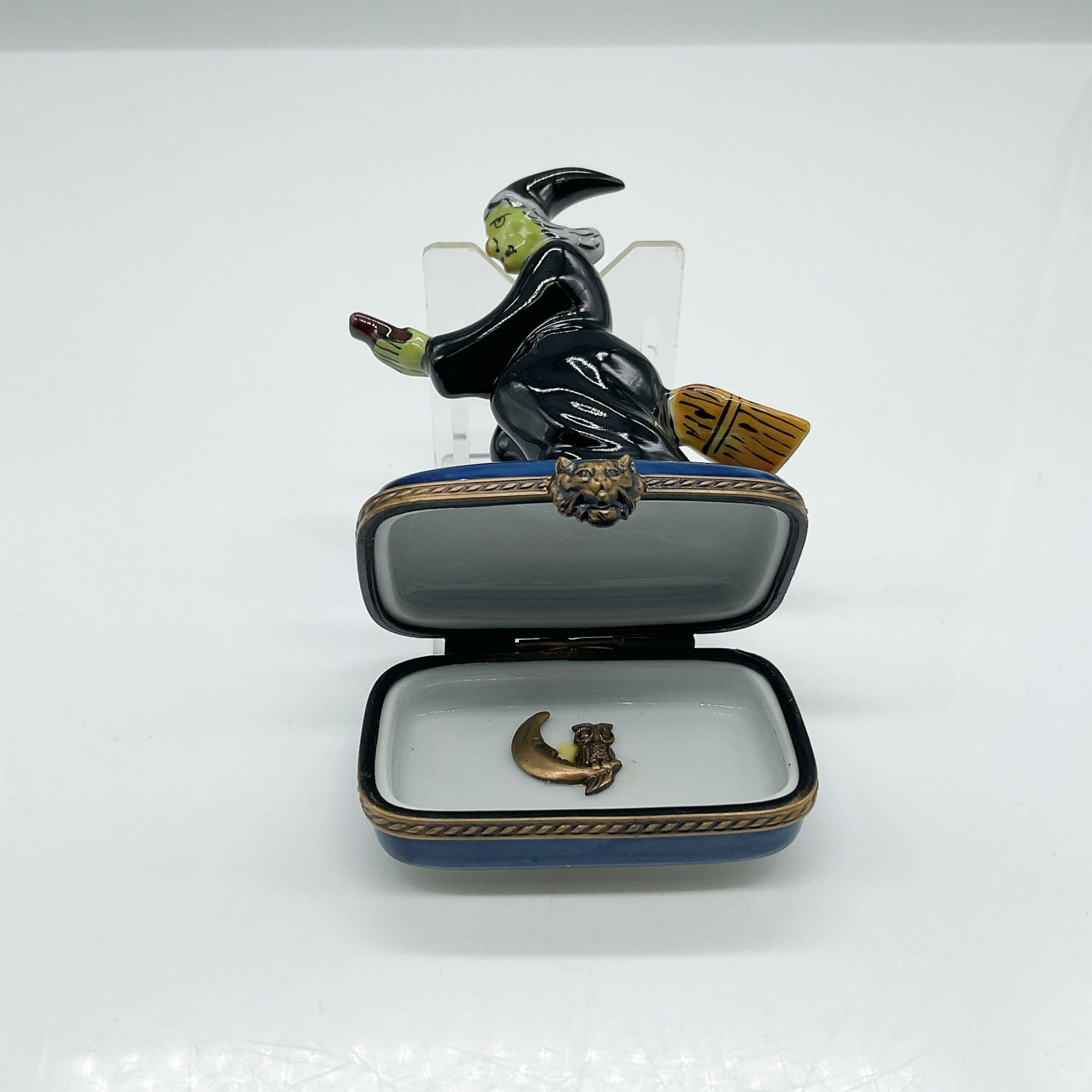 Exquisite La Gloriette Limoges porcelain trinket box featuring a hand-painted witch figure riding a broomstick atop a deep blue rectangular base. This charming French collectible is adorned with finely crafted metal fittings, including a detailed clasp with a sculpted face. The hinged box opens to reveal a delicate miniature moon and owl inside. Marked Peint Main Limoges France on the underside, signifying its authenticity as a hand-painted Limoges piece.
