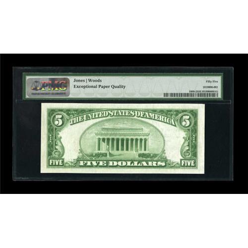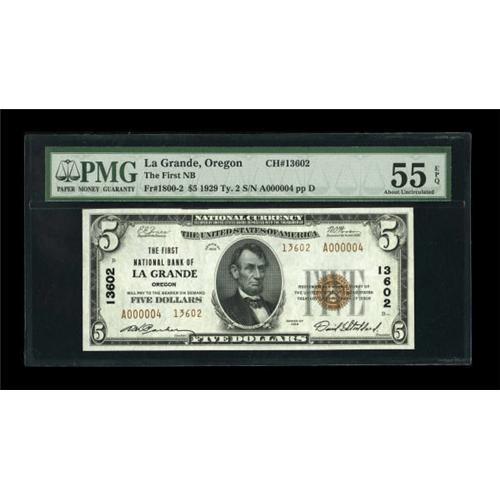 <B>La Grande, OR</B></I> - $5 1929 Ty. 2 <B>The First NB</B></I> Ch. # 13602<BR> A very scarce bank with only one auction offering since 1990. The census shows three uncut sheets, one of which has now been cut, with this is the first note from that sheet we have seen for sale. PMG has graded this serial number A000004 example <B>About Uncirculated 55 EPQ, </B></I> a grade which certainly appears conservative. <BR><BR><b>Shipping:</b> Coins & Currency (<a target="_blank" href="http://www.heritageauctions.com/common/shipping.php">view shipping information</a>)