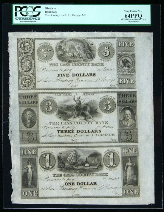 La Grange, MI. Cass County Bank. Undated $5-$3-$1 Uncut Sheet of Remainders. PCGS Currency Very Choice New 64PPQ. A lovely sheet of three notes, each individually a perfect Gem, but with a corner fold in the selvage that accounts for the assigned grade.