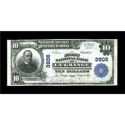 <B>La Grange, TX</B></I> - $10 1902 Plain Back Fr. 626 <B>The First NB</B></I> Ch. # 3906<BR>A fresh and nicely centered <B>Choice Crisp Uncirculated</B></I> example with purple stamped signatures. We'd have classified this note as a Gem but for a subtle counting wrinkle at right. The paper surfaces are well embossed and otherwise of Gem quality.<BR><BR><b>Shipping:</b> Coin/Currency (<a target="_blank" href="http://www.heritageauctions.com/common/shipping.php">view shipping information</a>)