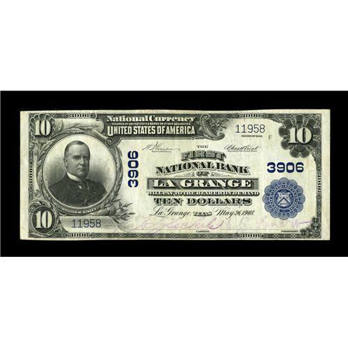 <B>La Grange, TX</B></I> - $10 1902 Plain Back Fr. 626 <B>The First NB</B></I> Ch. # 3906<BR>A nice large example from the Fayette County seat. <B>Very Fine,</B></I> with purple signatures.<BR><BR><b>Shipping:</b> Coin/Currency (<a target="_blank" href="http://www.heritageauctions.com/common/shipping.php">view shipping information</a>)