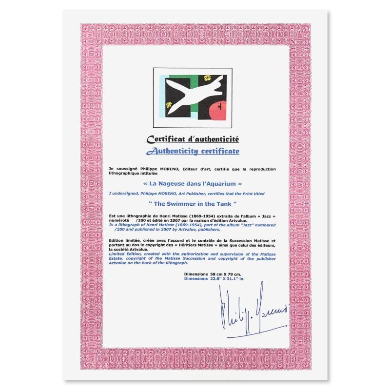 "La Nageuse dans l'Aquarium (The Swimmer in the Tank)" is a limited edition lithograph by Henri Matisse (1869-1954). This piece comes from an edition of 200 authorized by the Matisse Estate; the edition number is not on the piece itself but on the certificate. This piece comes custom framed. Includes Certificate of Authenticity. Measures approx. 37" x 29" (frame), 31" x 23" (image).