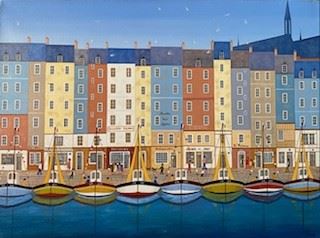Just a charming & colorful view of the townhomes & apartments of Hon Fleur. An original 21x29" by Fanch, is a stretched acrylic on canvas, with artist' s COA,