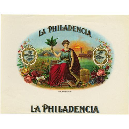 <B><I>La Philadencia</B></I></B></I><B> Cigar Label.</B></I> Full color lithographed 9" x 7" inner label with gold-embossed accents. A classical female, looking every inch the Great Tobacco Goddess, holds a leaf and a cornucopia overflowing with stogies. Cuban scenes behind her include a tobacco harvest and Havana's harbor at sunset. Altogether an excellent graphic evocative of a bygone era. Near mint.<BR><BR><b>Shipping:</b> Small Flat (<a target="_blank" href="http://www.heritageauctions.com/common/shipping.php">view shipping information</a>) <BR><BR><B>Important notice