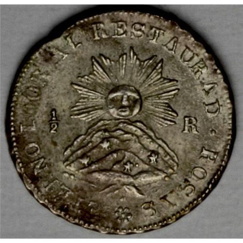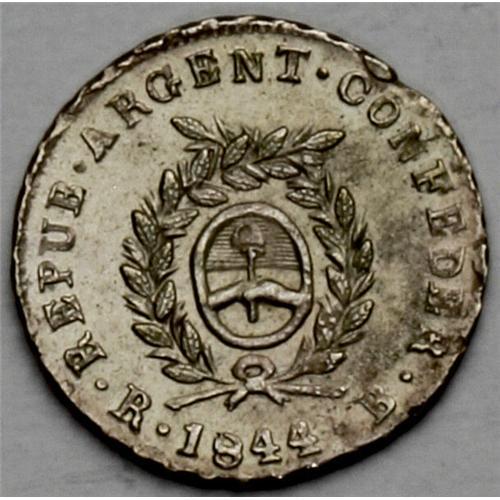 <B>La Rioja. 1/2 Real 1844-RB, </B></I>KM18, lightly toned UNC, full underlying mint luster, crudely manufactured but quite appealing. One year type and scarce in this quality.