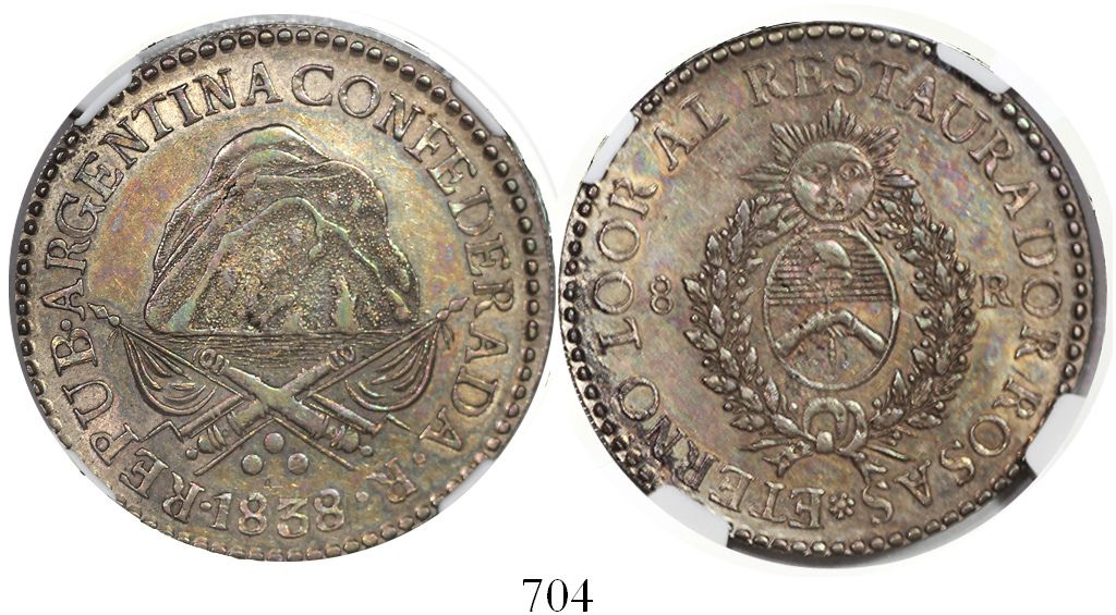 La Rioja, Argentina, 8 reales, 1838R, coin rotation, encapsulated NGC AU 55.