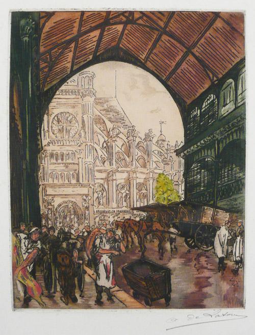 La Tour (20th Cent.) Color Etching "Paris Halles de Pavilion de La Bouchera" Signed lower right 9 1/2" x 7 1/2"