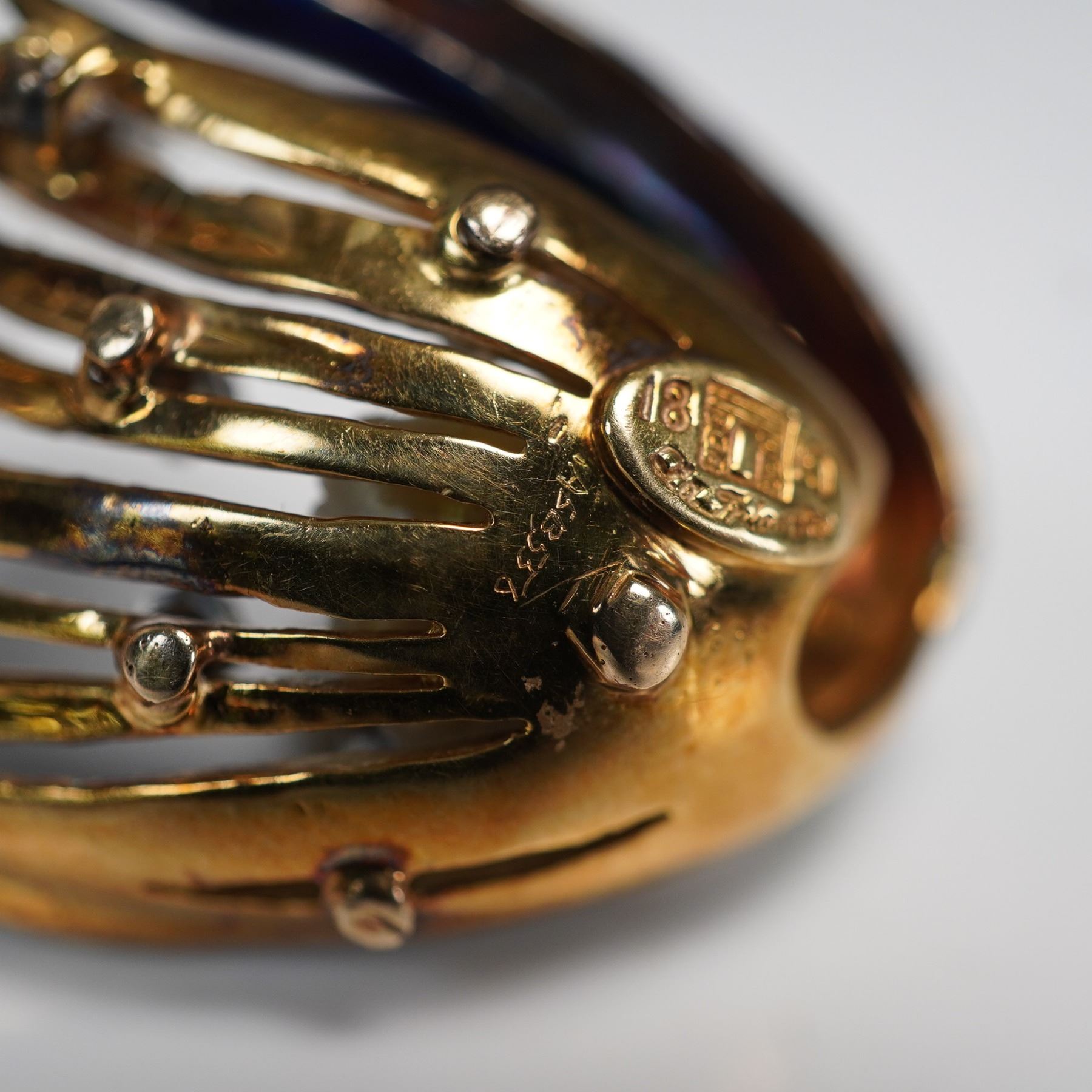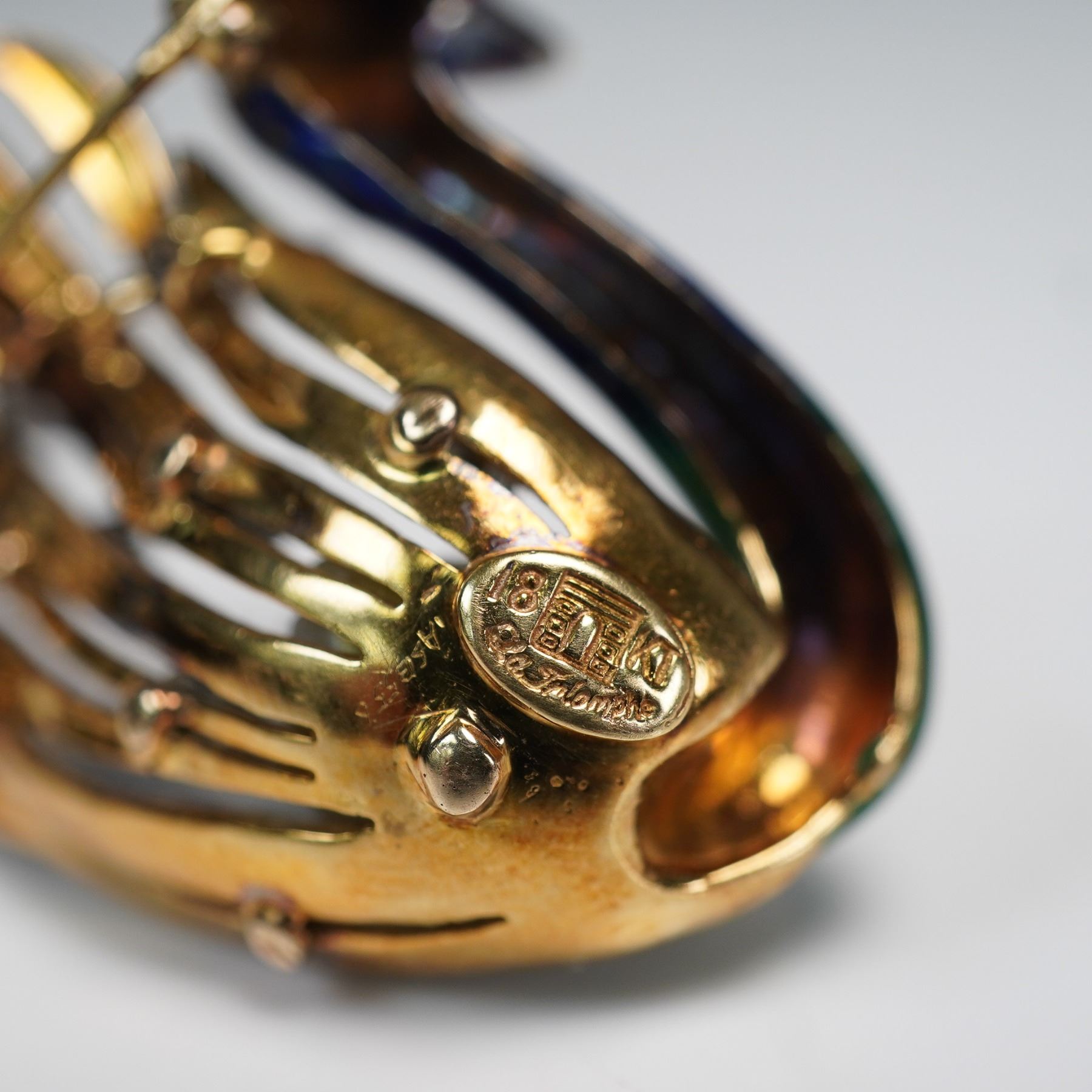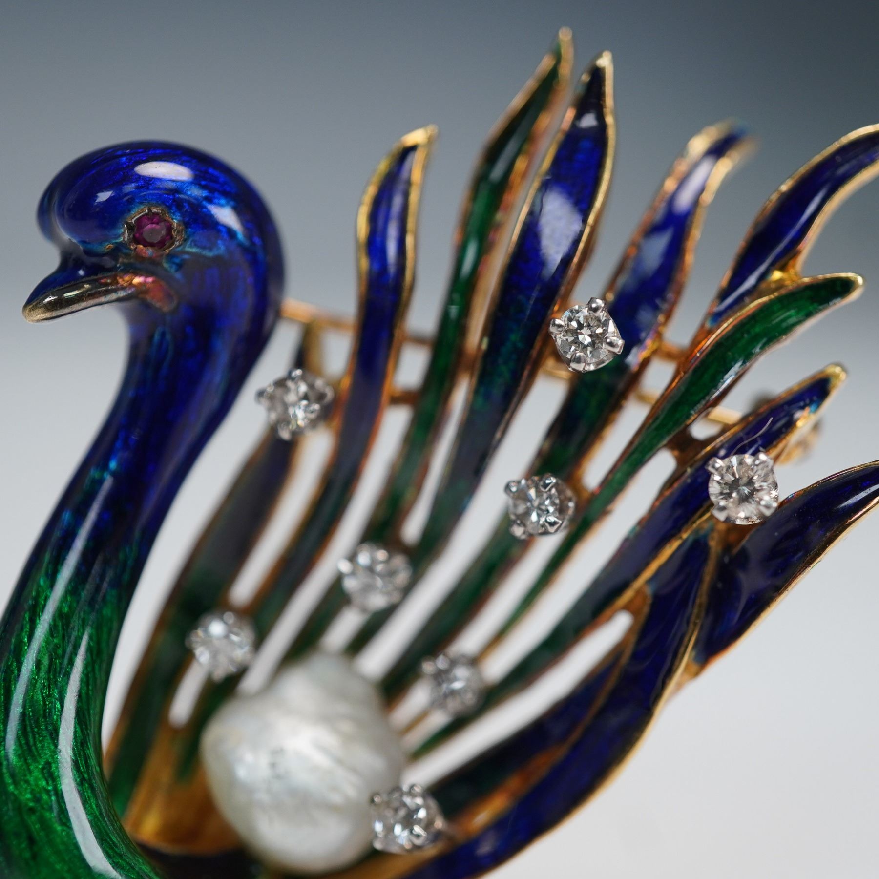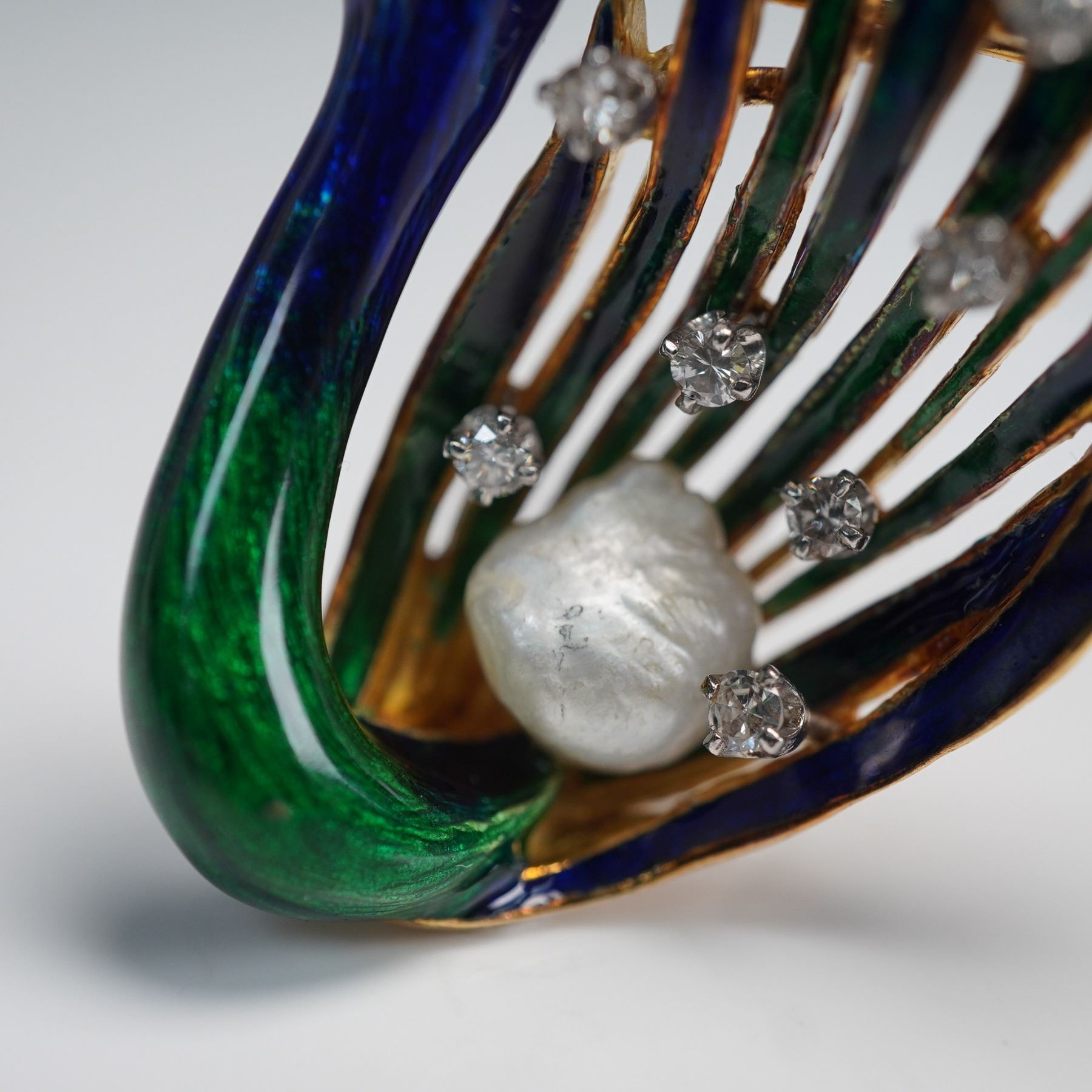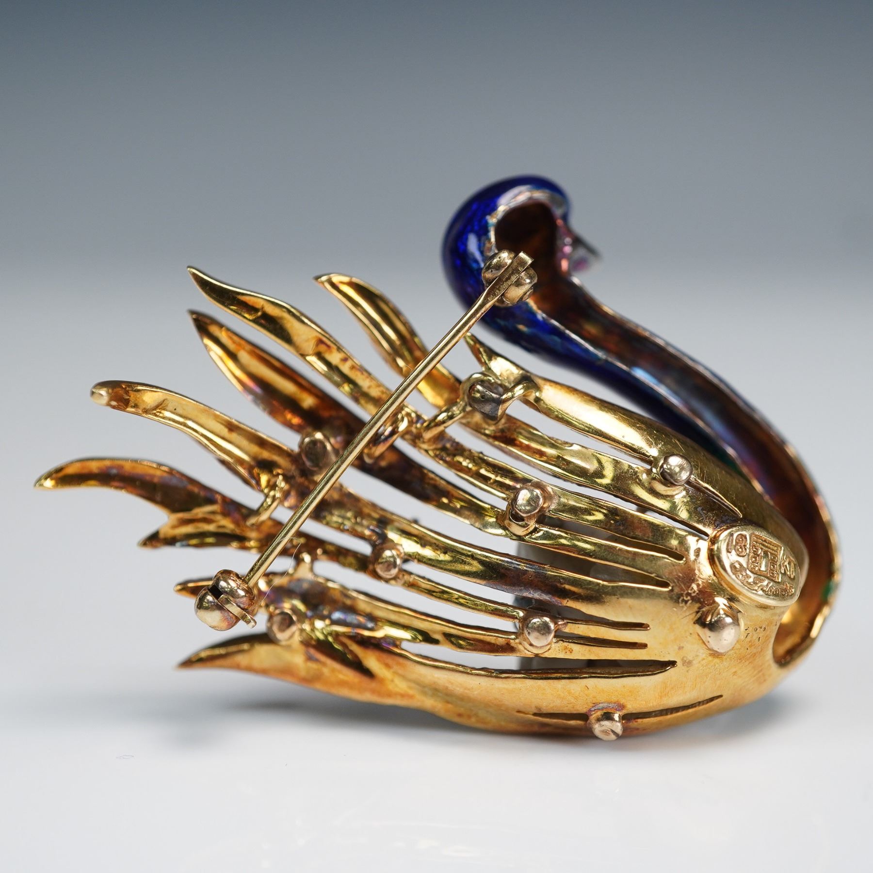 Designed by LA Triomphe, this 18kt gold swan brooch showcases meticulous enamel detailing that enhances the texture and elegance of the bird's form. The wing is adorned with approximately 0.50 cts of round brilliant-cut diamonds, while a freshwater pearl accents the base of the design. Known for their fine craftsmanship, LA Triomphe pieces are highly regarded for their artistic quality and use of luxurious materials. The brooch weighs approximately 19.34 grams with all stones and features included.