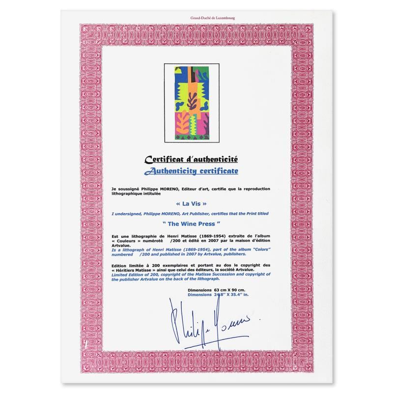 "La Vis" is a limited edition lithograph by Henri Matisse (1869-1954). This piece comes from an edition of 200 authorized by the Matisse Estate; the edition number is not on the piece itself but on the certificate. Includes Certificate of Authenticity. Measures approx. 25" x 35.5" (image).