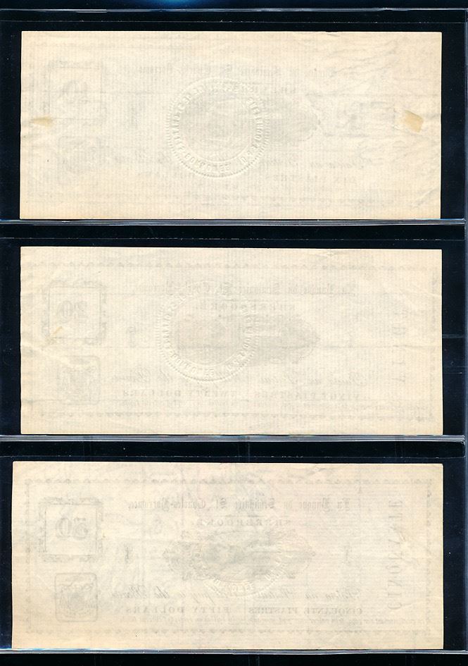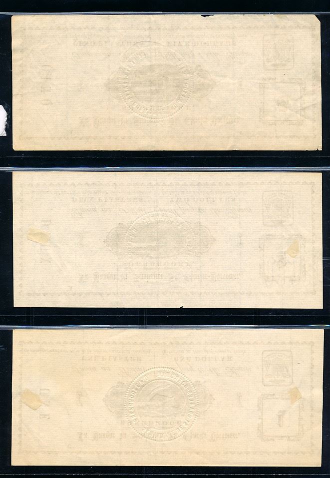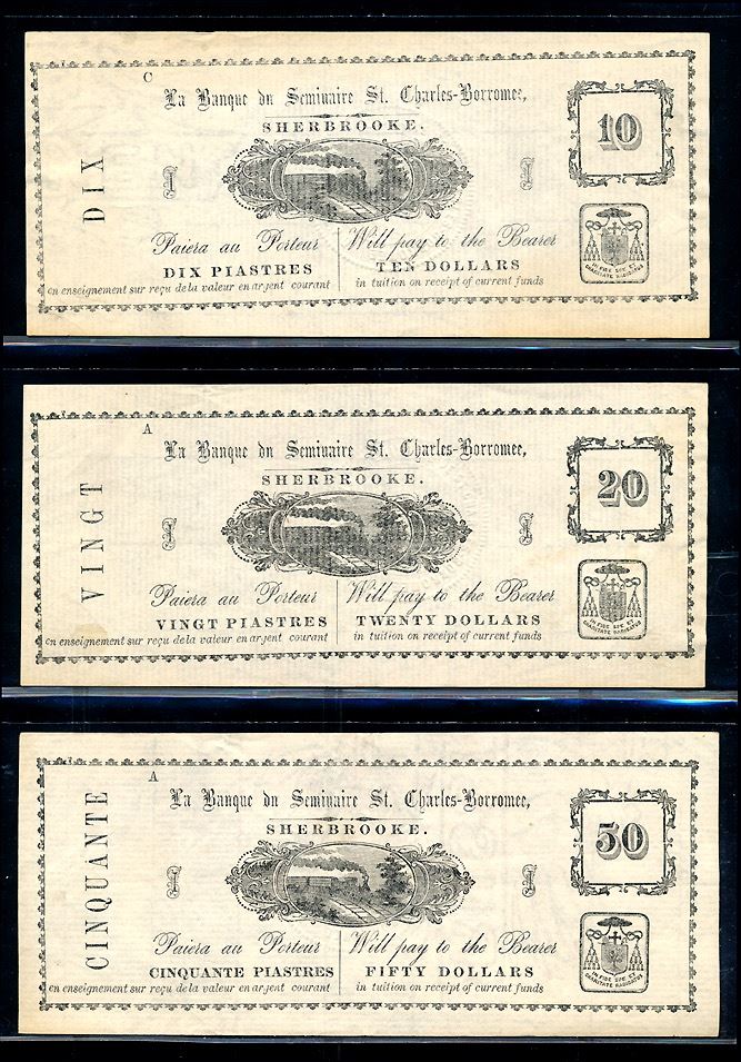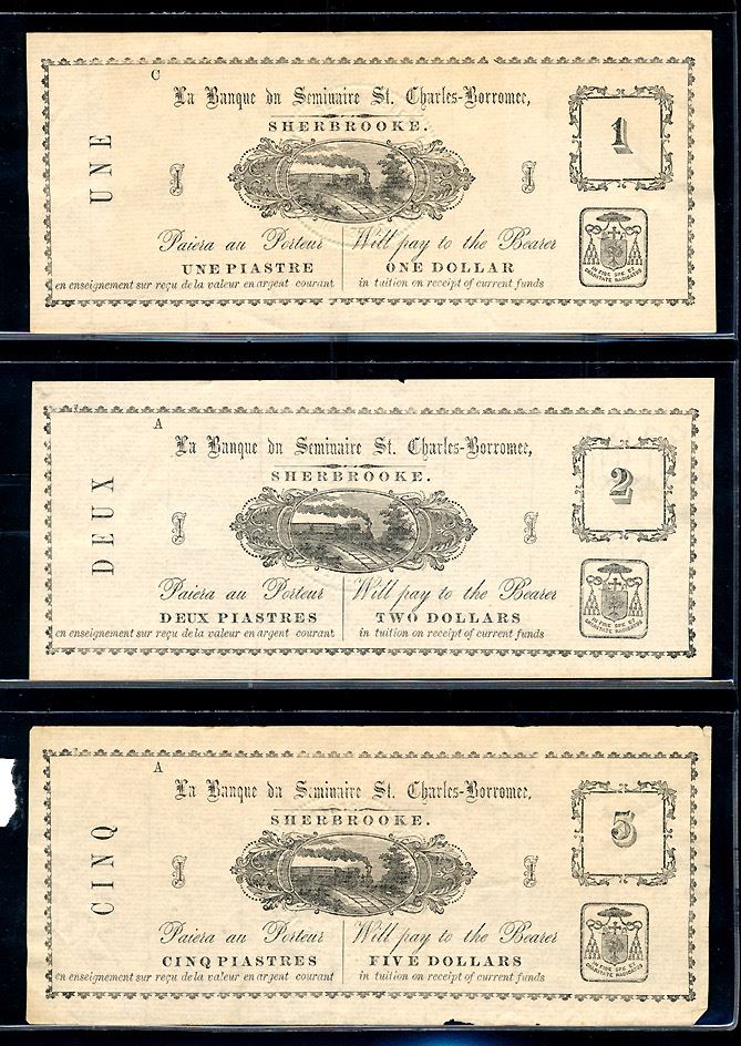 Lot of six uniface notes of "La Banque du Séminaire St. Charles - Borromée, Sherbrooke, Quebec", printed in black, in denominations of $1 - 2 - 5 - 10 - 20 - 50. General condition is EF+. 82 x 185 mm. Undated, but presumed to be late 19th century. These may be a sort of receipt, as they are marked "Will pay to the bearer ... in tuition on receipt of current funds." in French and English. The name of the institution and denominations are in French only. Central vignette of a train. We can find no reference to these notes, and no doubt they are quite rare.
