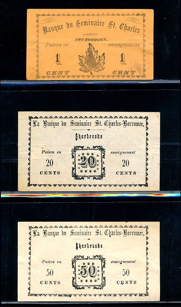 Lot of six uniface notes of "La Banque du Séminaire st. Charles - Borromée, Sherbrooke, Quebec", comprising : 1 - Note denominated as 1 cent "Paiera en enseignment" printed in black on orange stock. This one, alone, is named as "Banque du Séminaire St. Charles". 60 x 107 mm. 2 - Notes of similar design, denominated as 20 cents and 50¢. 60 x 120 mm. 3 - larges notes, denominated as $1 - $2 & $5. 70 x 182 mm. The $1 is printed in violet, and is quite faded; the $2 is in black, the $5 is in green. The central vignette of the three is "BSSC" in an arabesque lozenge. These are also marked "will pay to the bearer in tuition on receipt of current funds". Here as well, we find no reference. All six of these notes show remnants of stamp hinges on the reverse. Surely quite rare, and though undated, were probably issued in the late 19th century.