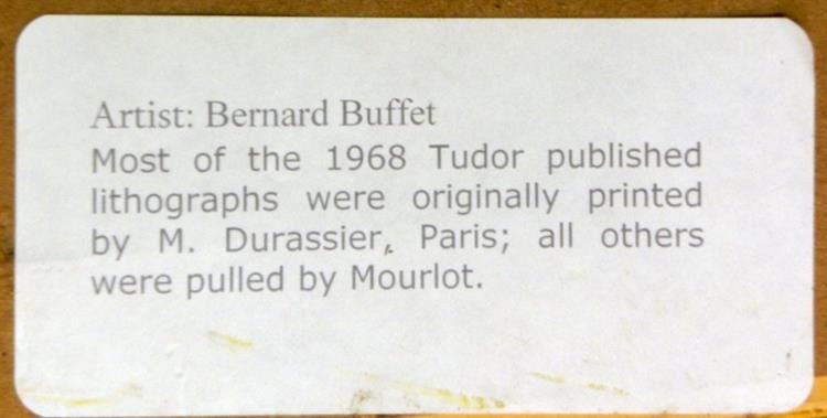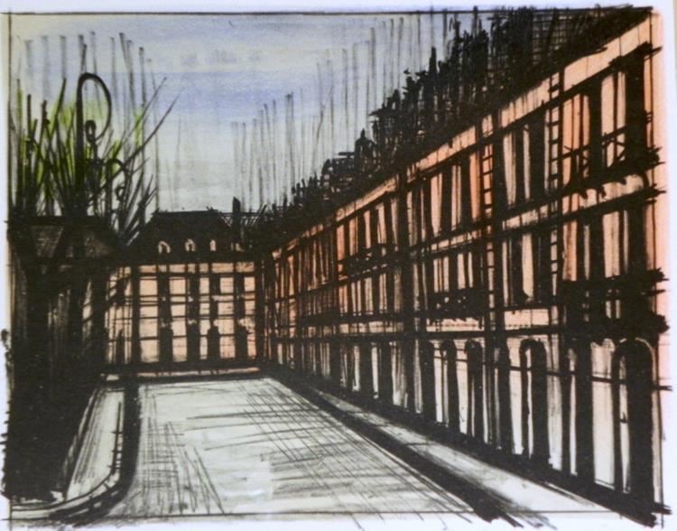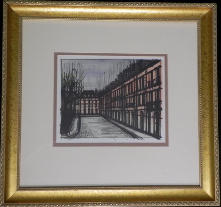 Artist: Bernard BuffetTitle: La Place des VosgesMedium: LithographPublished Date: 1968Edition: FirstPublisher: TudorPrinter: Mourlot Printing PressFraming: Custom hand assemble wood frame, using 1.5" moldingMatting: Double, all acid free material, uv glassImage Size: 8 1/2" x 6 1/2"Frame Size: 17 1/2" x 16 1/2"Condition: Near Mint**Most of the 1968 Tudo published lithographs were originally printed by M. Durassier, Paris; all others were pulled by Mourlot.*There is a bracket on the back of the frame for hanging. Information about the print are on the back of the frameBiographyFor his admirers, Bernard Buffet is the "pure genius". Bernard Buffet is recognised as a master in his art, and his paintings are collected in the most famous museums around the world. Bernard Buffet represents a typical demonstration of the divorce between the French and Contemporary Art. Popular artist by excellence, Bernard Buffet loved by the public is however detested by elitists whom hold against him his prolixity : 8,000 paintings, water colors,drawings, lithographs and engravings.So few material and very little colour, only greys, black, "bistres", and greens. Bernard Buffet's style can be recognised among others by a network of "dry" straight lines grey gaces, wrinkled foreheads, scarce straight hair, tensed hands. His characters seemed crucified. This new artistic personality is recognised : Bernard Buffet's style is born.Bernard BUFFET has also been classed as a figurative painter, opposed to abstracts, but also and certainly to painters which practised "Social Realism".*Retrieved from: http://museebernardbuffet.com/enminibio.html