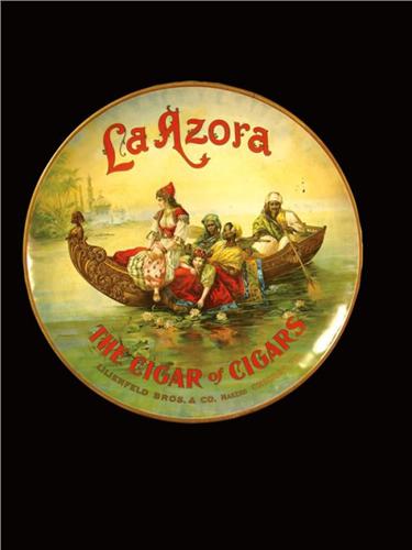 LaAzora Cigars Tin Charger, Lilienfeld Bros. and Company Chicago, IL. Best one we have ever seen. Minor stains otherwise excellent original condition. 24 inch dia.