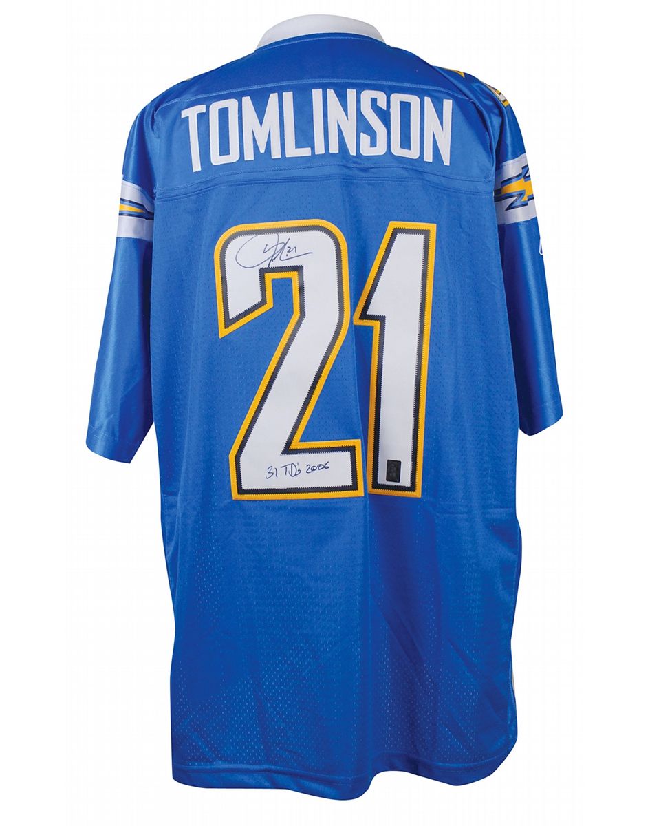 Two items: official Reebok San Diego Chargers replica jersey, with sewn on numbers and letters, signed on the number in black felt tip, adding “31 TD’s 2006”; and an official Riddell Chargers helmet, signed on the side in black felt tip. In fine condition.