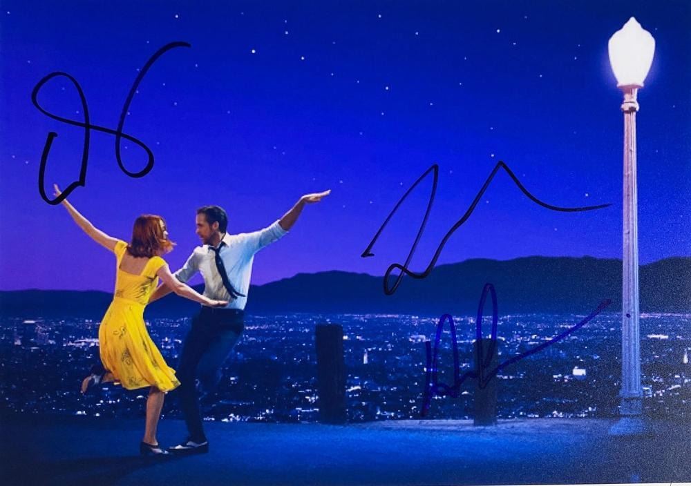LaLa Land facsimile signed movie photo autographed by Ryan Gosling and Emma Stone. 8x10 inches. This item is a reprint of an original autograph