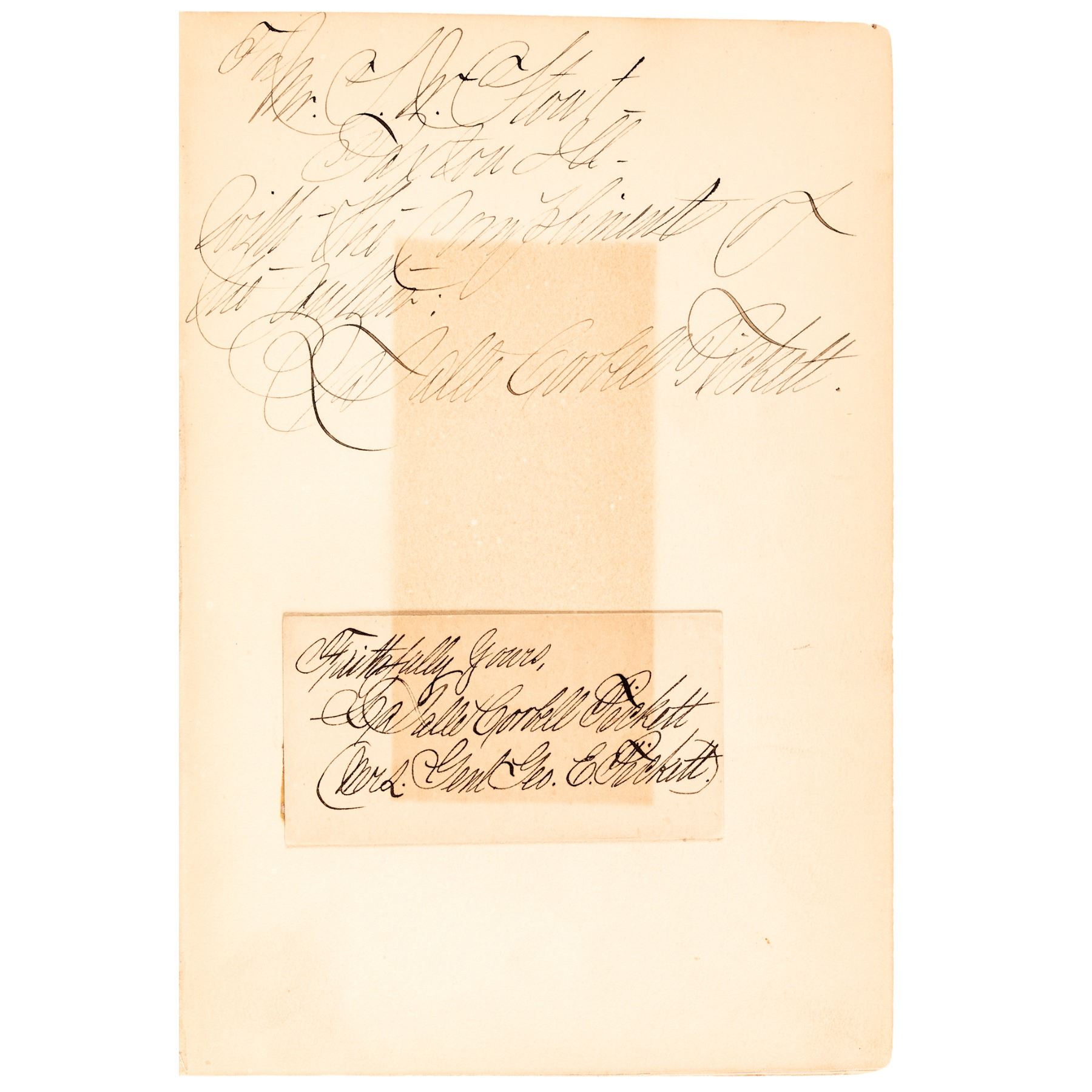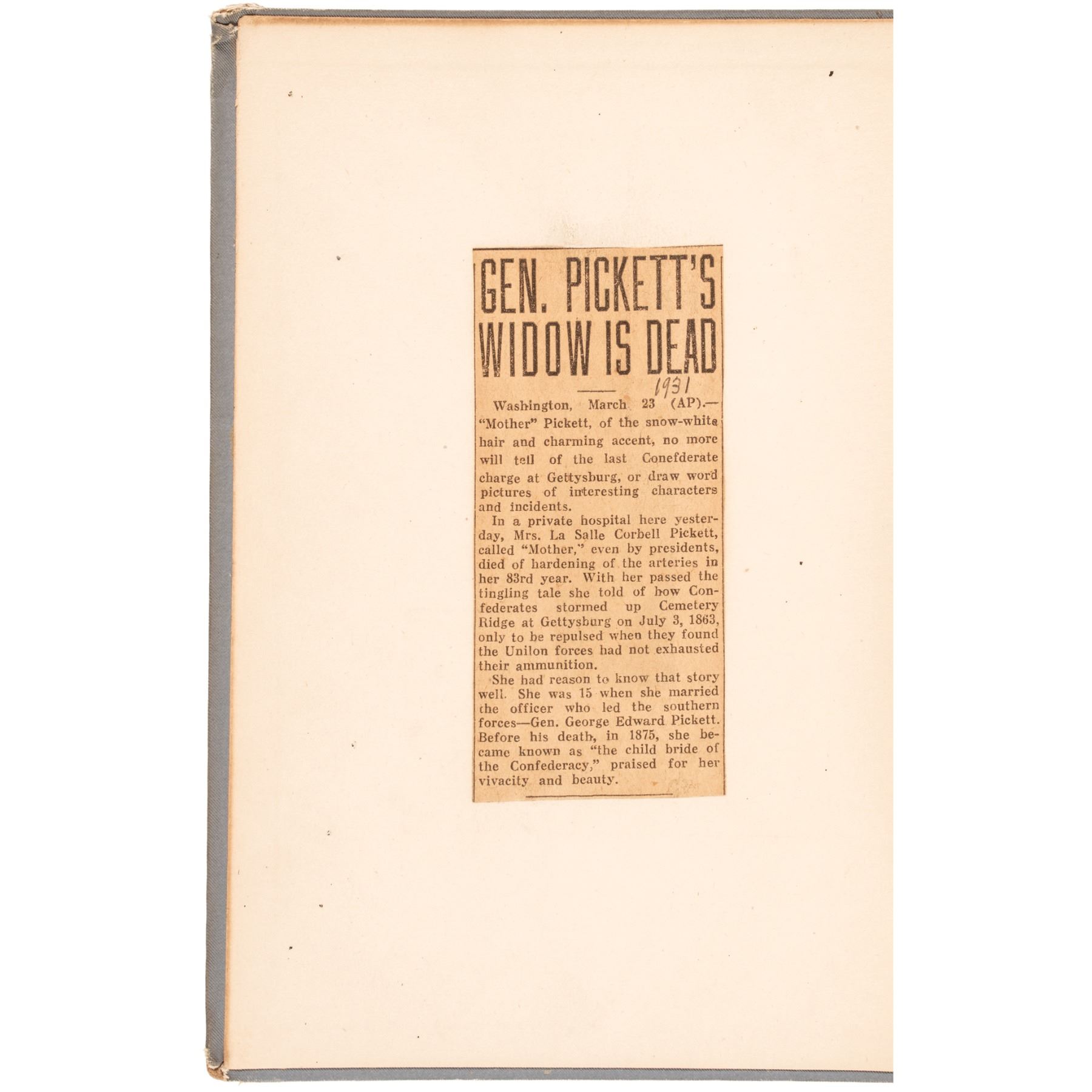 1900-Dated, 2nd Edition Hardcover Book titled, “Pickett and His Men” Dual Signed by author Lasalle Corbell Pickett, and Signed, “Lasalle Corbell Pickett”, Author and the Wife of Confederate General George E. Pickett, Published by Foote & Davies, Atlanta, Fine. This Gray Hardcover Book with title in gilt on front cover and spine, measures about 6.5” x 8.5”, with 439 pages. Written by Lasalle Corbell Pickett, she has Signed “Lasalle Corbell Pickett” on the first blank page and a prior owner has also tipped in a Card Signed, “Faithfully Yours, Lasalle Corbell Pickett (Mrs. Genl. Geo. E. Pickett.)”. Inside front cover has an original newspaper clipping headed, “Gen. Pickett’s Widow is Dead” tipped in (1931) which has caused matching tone on the opposite front signature page affecting both Signed Inscriptions, wear from use to covers and spine, internal pages are mostly crisp.