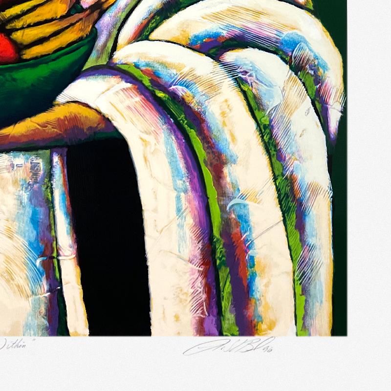 "Warmth Within" is a limited edition printer's proof serigraph on paper by LaShun Beal, numbered 1/15 and hand signed by the artist. Includes Letter of Authenticity. Measures approx. 35" x 30" (border), 29.5" x 25" (image).
