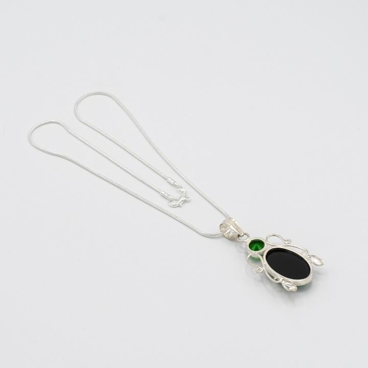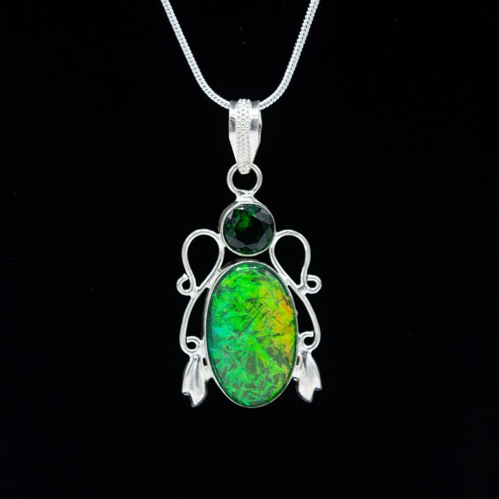 Beautiful Lab Created 21.5 Ct Green Rainbow Opal. Pendant. Brilliant colors and high polish and luster. Mounted in elaborately designed .925 silver overlay. Includes a 20" chain.95 Cttw or 19 total gram weight