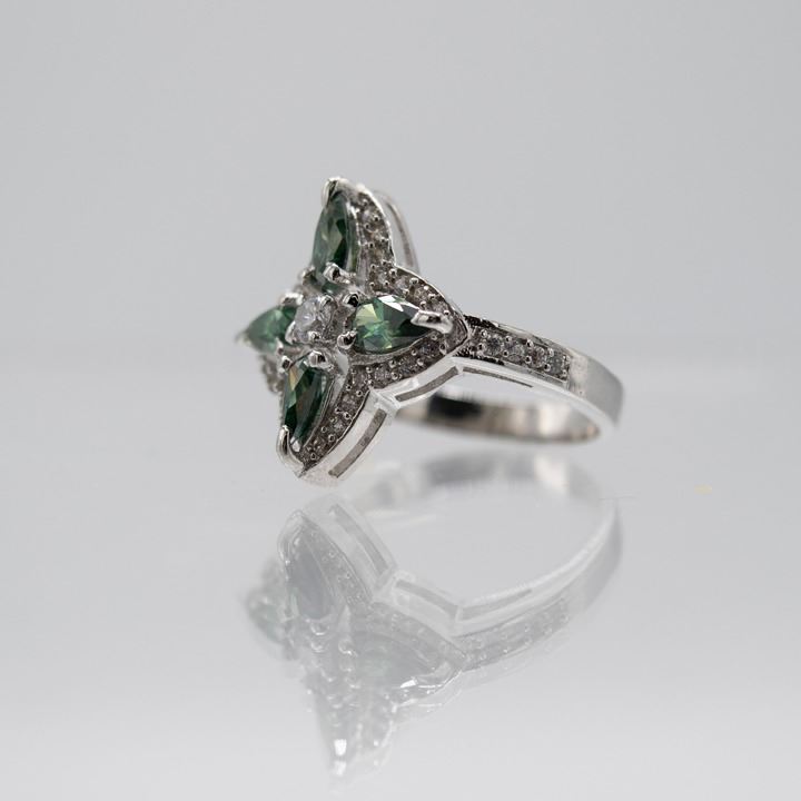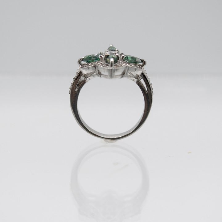 Amazing 3.35 Ct Diamond Ring. This lab created diamond ring has 4 eye VVS1 mint green pear cuts with cz accent stones. These 4 pear cut lab diamonds will test positive for a diamond on almost any diamond tester. Mounted in solid .925 sterling silver complimented by rhodium which is a precious metal that is in the family of platinum. Rhodium overlay. It is also tarnish resistant. Size 7 1/2. Total weight is approx. 4.4 grams
